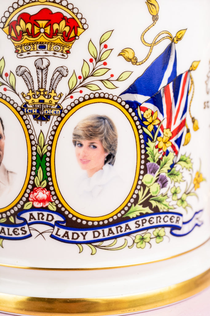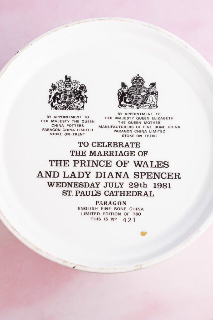 An exquisite example of bone china artistry, this Vintage Limited Edition Royal Wedding Loving Cup was expertly produced by Paragon China to celebrate the 1981 marriage of the then Lady Diana Spencer to Prince Charles, son of Queen Elizabeth II. Gleaming on either side with articulated handles executed in a golden lion motif, this attractive souvenir remains nestled in its original deep burgundy presentation box. Lined with satin and embellished with gilt, the collectors' case opens to display both the cup and its accompanying Certificate of Authenticity in grand fashion.