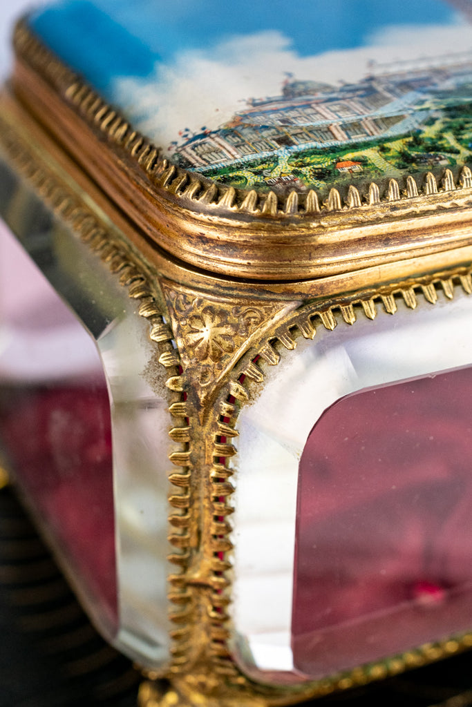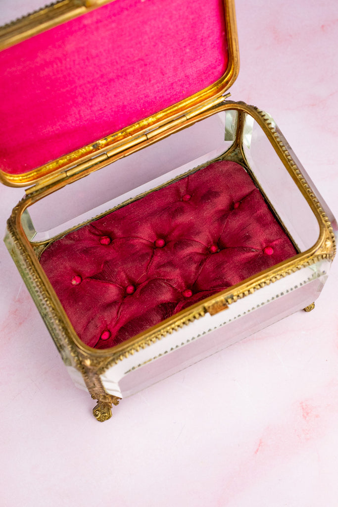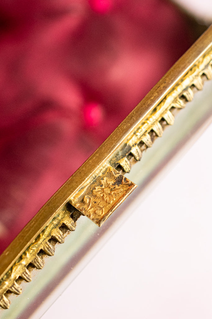 Found at market in Paris, we are so pleased to present this delightful Antique French Jewelry Box featuring the Eiffel Tower as it stood during the 1900 Paris Exposition. A generously proportioned box, it is fashioned from thick, beveled glass and framed in gleaming gilt metal.