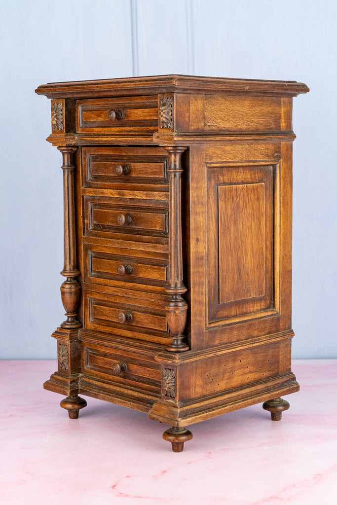 As an opportunity to work in small scale - wasting less wood - and as practice for the finely detailed work of 19th century furniture building, pieces like these were typically handled by the woodworker's apprentice. They were fine opportunities to hone their craft and prove that they had acquired the skills needed for their trade. The perfeclty dovetailed drawers, fluted columns, leafy rosettes, tiny wrap around moldings, and elegantly turned feet and drawer pulls of this piece bear silent witness that a cabinet maker had learned his trade well.