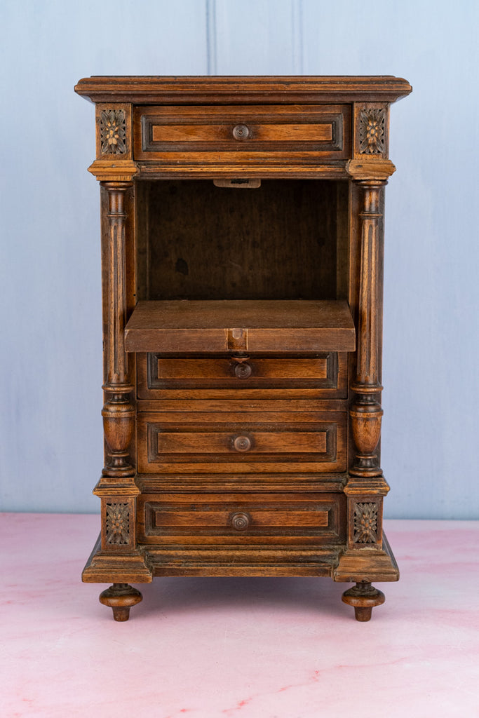 Found at market just outside of Paris, this exquisitely crafted French Apprentice's Cabinet was once part of a grand doll's bedroom set. With four raised panel drawers and a drop front storage compartment (barely large enough to house a teacup), this piece was the doll's nightstand, a finely detailed example at small scale of the nightstand (then called a commode) that would have stood in both the child's and Maman and Papa's room.