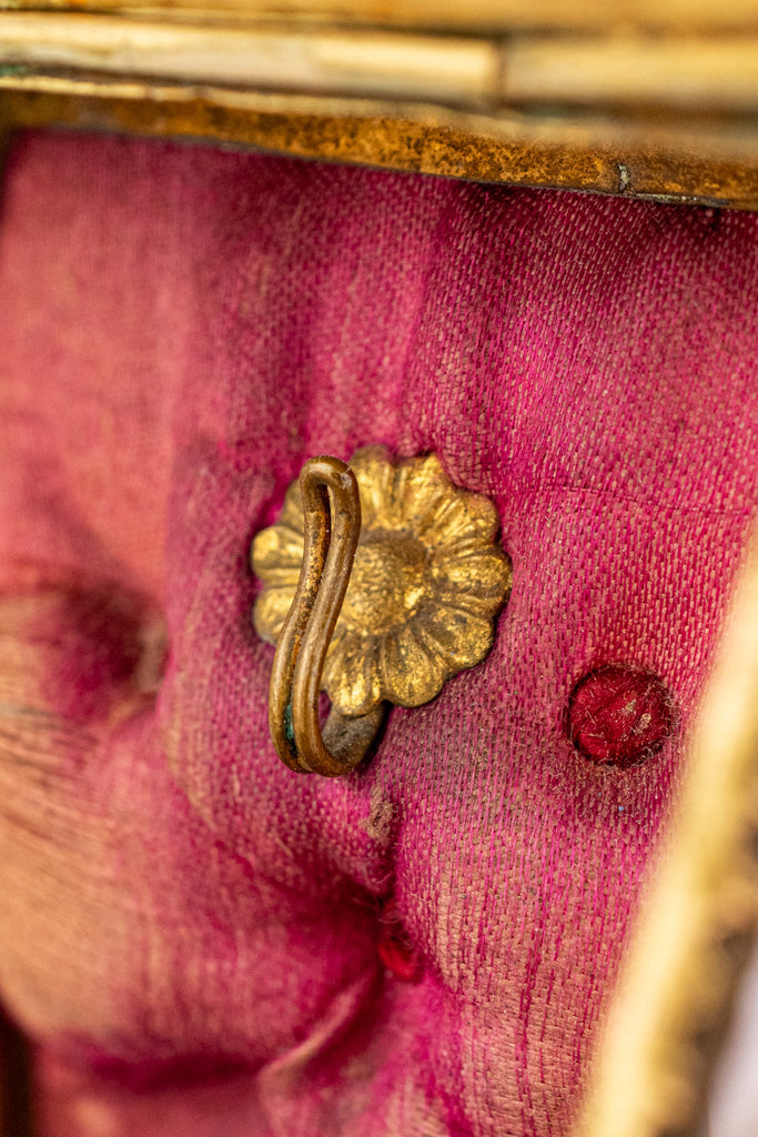 During the late 19th century, Parisian artisans created elaborate jewelry boxes and pocket watch holders. The pocket watch holders were known as ‘casque porte montre’, or pocket watch caskets. These little gems often featured a beveled glass box mounted on sculpted brass legs with an enameled painting in the back or a tufted velvet pillow lining. A small interior hook at the top allowed a favored pocket watch to be carefully displayed.