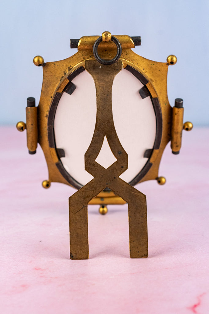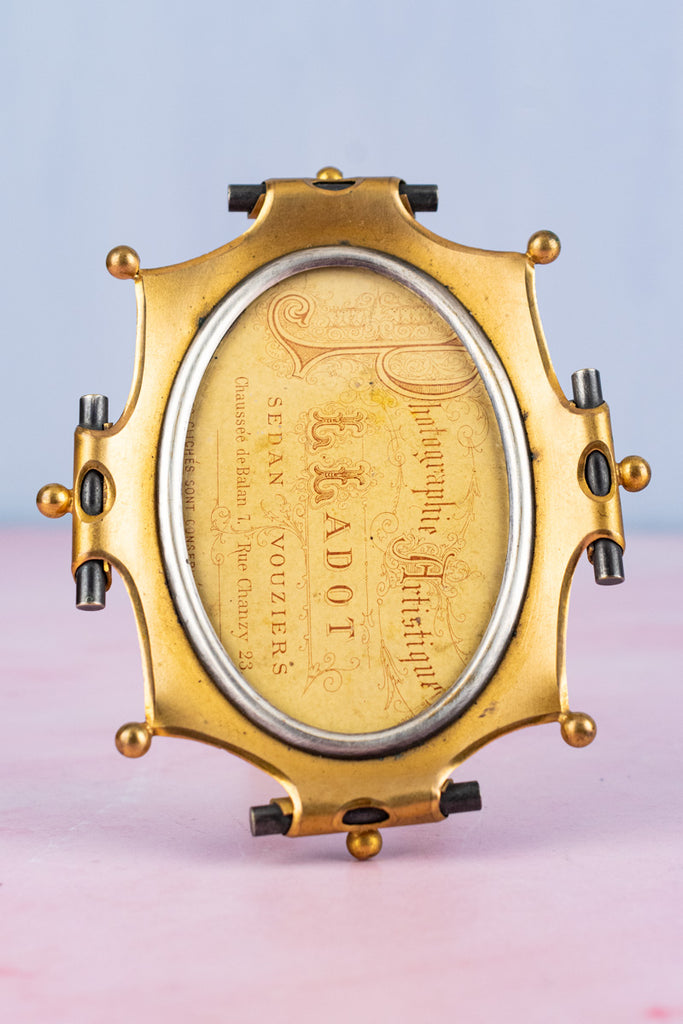 Composed of lustrously gilt metal curling around black batons, this frame can be supported elegantly on a shelf, desk, or piano by its clever easel, or can be hung from an attached ring. This piece promises to showcase your most treasured photograph with the timeless grace and fresh style of 19th century France.