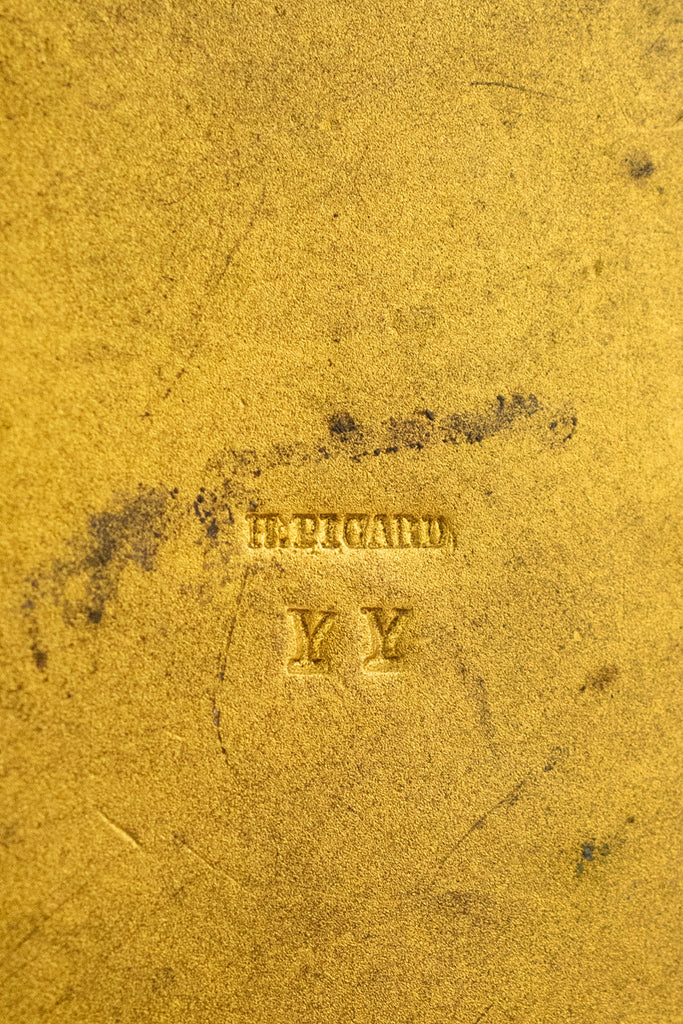 This piece was finely crafted by Henri Picard, a renowned 19th-century French bronzier and gilder active in Paris from at least 1831 until around 1864. He established his workshop initially at 6 rue Jarente and later at 10 rue de la Perle, producing high-quality gilt-bronze decorative objects such as candelabra, clocks, sculptural lamps, and mounts for furniture and porcelain. Picard’s work is associated with the rich ornamental style of the period and exemplifies the detailed chasing and fine mercury gilding prized in decorative arts of mid-19th-century France.