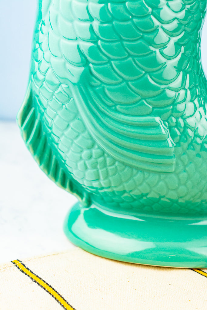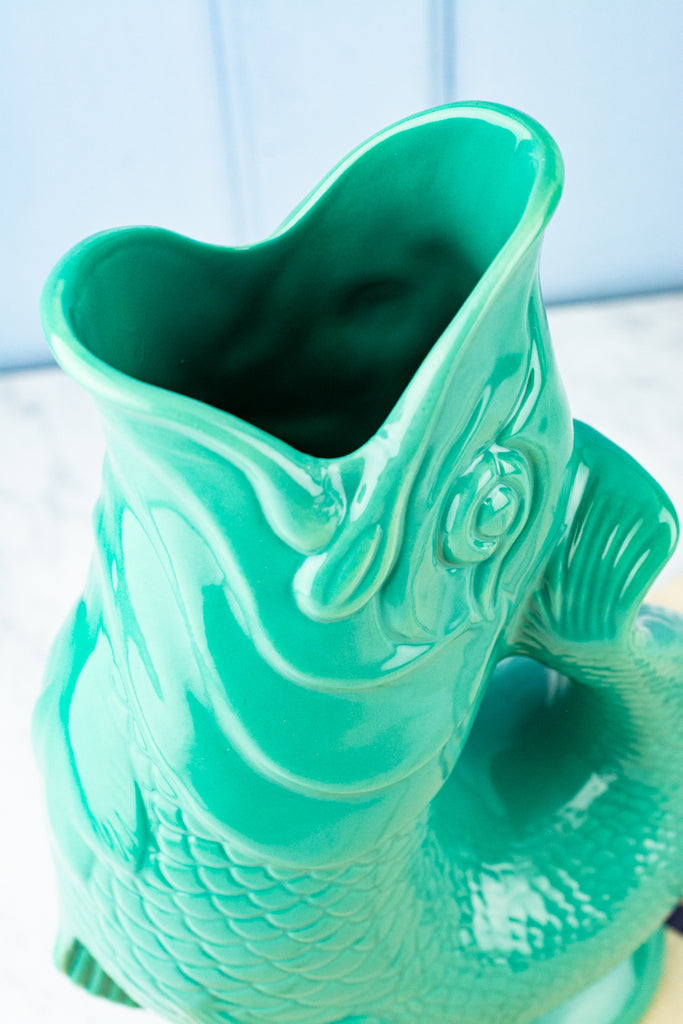 Coming to us from the still-active Staffordshire kilns of Stoke-on-Trent potter Wade Ceramics, this whimsical fish pitcher silhouette has charmed and amused generations since it was first produced in the 1860s. Shaped like an open-mouthed fish, the jug has also been known as a "Glug Glug" and "Gurgle Jug" and originally had the tagline “a novelty which always attracts attention”. When liquid is poured at 3/4 full, it produces a gurgling sound, the result of an air-lock created in the hollow fishtail which then bubbles out.