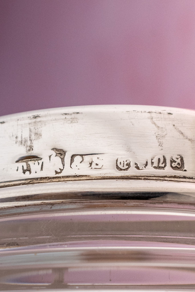 Enter this exquisite Antique English Silverplate & Crystal Cocktail Shaker with a lovely cut crystal cylindrical body that transcends mere decoration with its more practical purpose - to ensure a firm grip while shaking or swirling its precious contents. Not to be outshone by the sparkling crystal with its geometric and starburst motif encircling the perimeter, the silverplate neck and stately cap gleam resplendently with refined elegance. Complete with its original silver mount and integrated strainer and cap, the upper ring of the shaker is sidestamped with the mark of Birmingham, England's venerable Thomas Wilkinson & Sons.