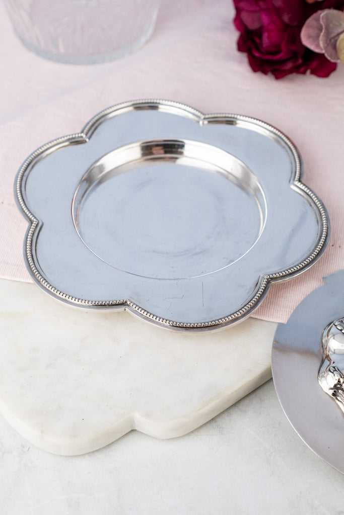 In true Victorian fashion, the regal glass dish and lid are presented atop a gleaming, scallop-edged silverplated liner trimmed in delicate beading, which can also be used separately. Crafted in a size ample enough to serve a good quantity of butter or clotted cream at table, this elegant dish with its lid and underplate would also make handy servingware for biscuits at tea time, nuts, candies or bon bons or even jam or decorative sugar. With its gracious charms, this pretty and versatile dish is sure to become a well-loved addition to your collection.