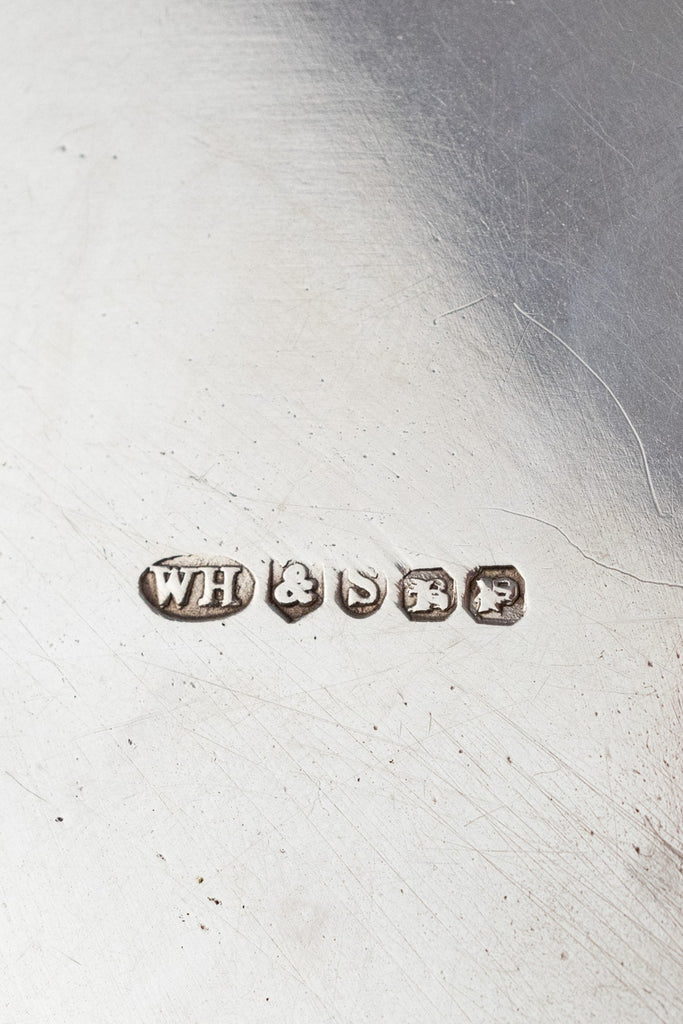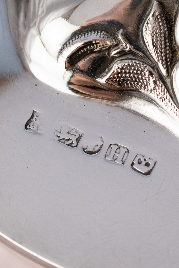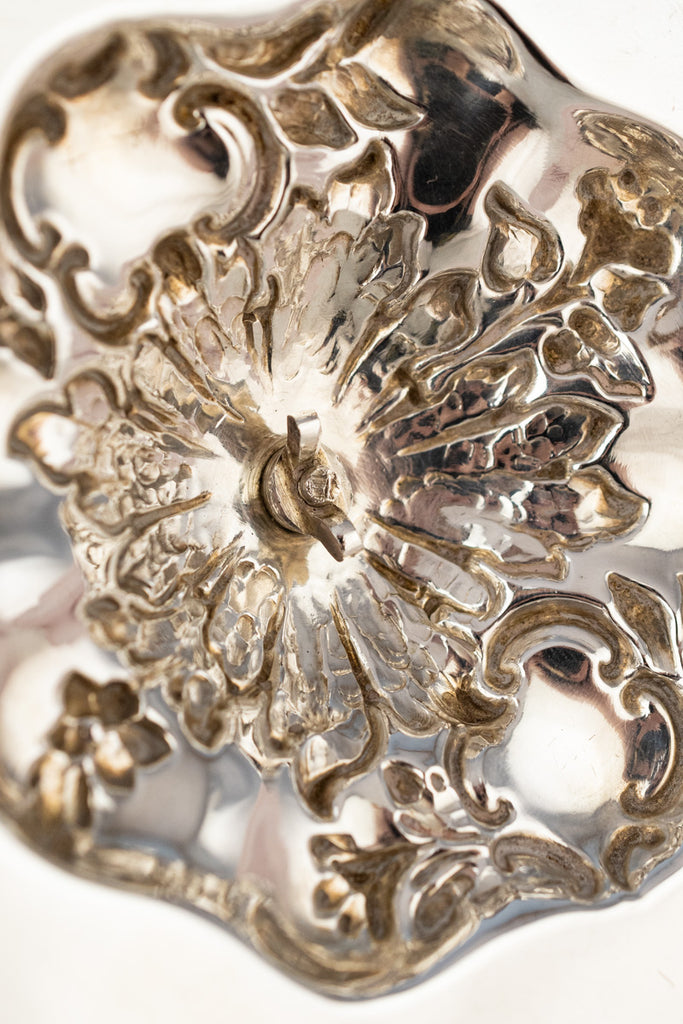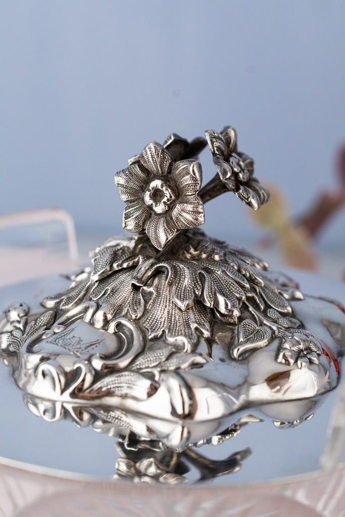 Found at a silver market in the north of England, we are pleased to offer this gorgeous Victorian Sterling and Glass Dish with its elegant silverplated base. A grand articulated finial depicting a trio of sweet posies rises cheerfully from the center of the sterling silver lid, which is notched to nestle between the dish’s tab handles to hold it securely in place. Stamped with marks for sterling silver and production in London, the intricate lid seems to float above the sleek lower vessel with its thick faceted walls and cut sunburst base, designed to help keep temperature-sensitive contents cool.