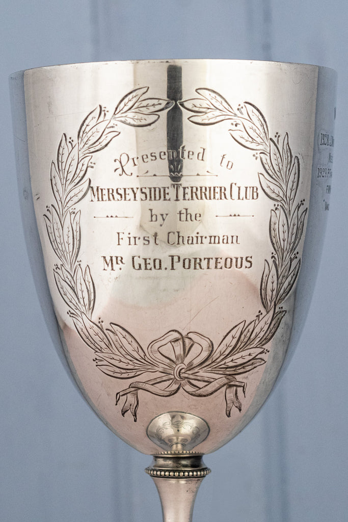Terrier clubs in England emerged in the 19th and 20th centuries as an evolution of the growing popularity of selective breeding and the formation of the Kennel Club in 1873. Dedicated fanciers gathered to promote specific breeds, establish standards, and encourage participation in dog shows and trials. These clubs, such as the Scottish Terrier Club of England formed in 1883 and the North of England Irish Terrier Club formed in 1906, along with the Liverpool area Merseyside Terrier Club which is celebrated on this shining trophy cup, played a crucial role in standardizing breeds and preserving the terrier's working traits for both sport and companionship.