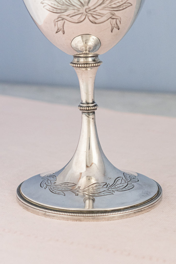 Found at market outside of London, we are captivated by the charming provenance of this Vintage English Silverplate Dog Show Trophy Cup. With a sleek silhouette that tapers towards a slender stem embellished with bands of beaded silverwork, this lovely cup rises from a grand pedestal engraved with celebratory laurel. An additional garland of laurel gathered with an elegant bow surrounds a heartfelt dedication: