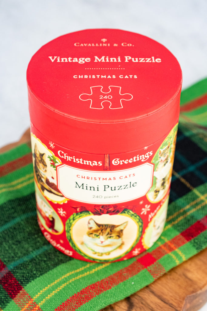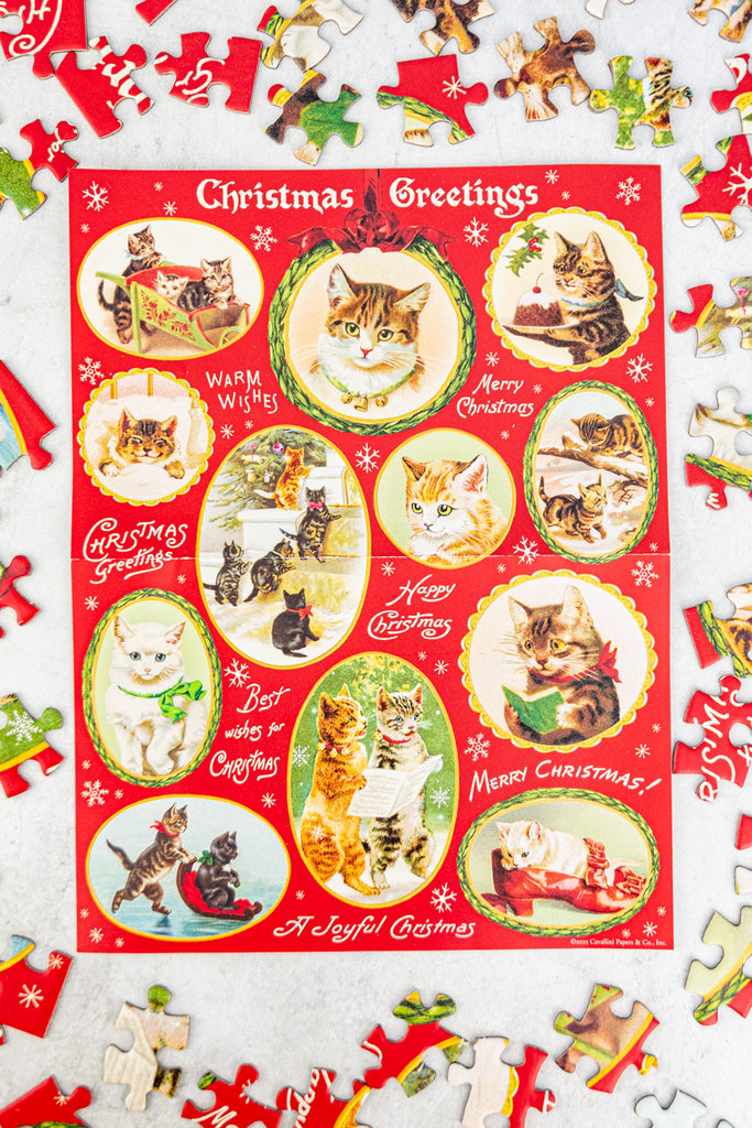 Created using charming vintage illustrations found in their vast ephemera archives, this mini Christmas Cats Jigsaw Puzzle from Cavallini is sure to bring a smile. From caroling cats and sledding cats (not to mention baking cats) to festive sentiments, these adorable felines proclaim Christmas Greetings to one and all!