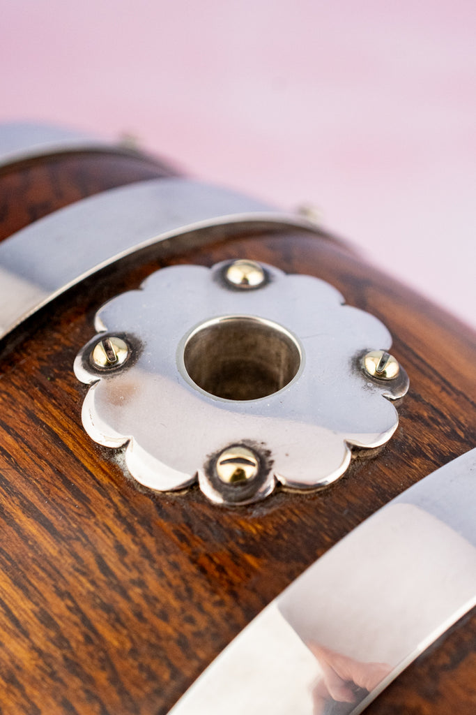 For the exceptional home bar and the centerpiece of your next gathering, we are thrilled to present this magnificent Antique English Oak and Silverplate Spirits Dispenser. Crafted in the form of a miniature barrel banded with gleaming silverplate hoops, this stately vessel is complete with a fully functional spigot that is sure to impress guests as a delightful conversation piece.