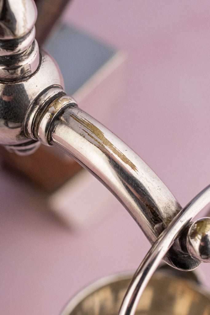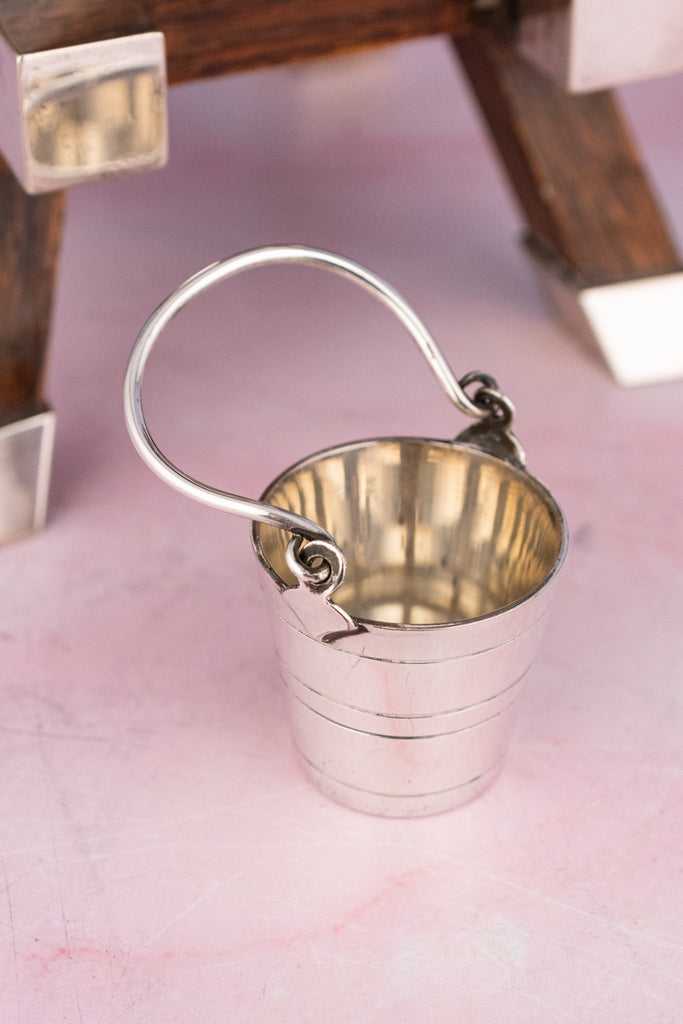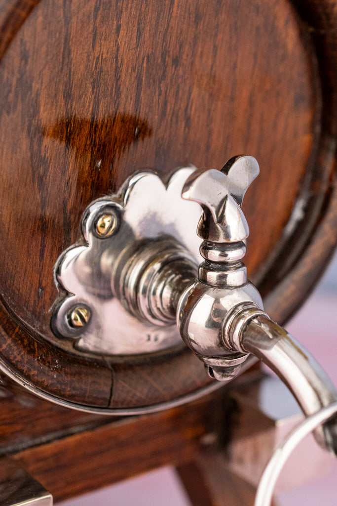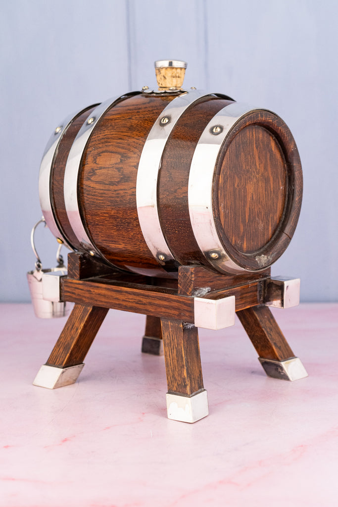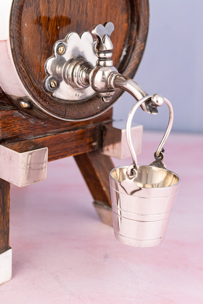 Exceptional in every detail, this handsome accessory was found at market in the north of England. With richly toned wood, stained by hand, the gorgeous supporting frame is trimmed with silverplate fittings and cradles the barrel as it elevates the dispenser for visual impact and convenient spirits access. A silverplate-topped cork stopper on the upper surface of the barrel permits easy filling with your most prized spirits, while the silverplated spigot mechanism on the front allows for neat dispensing into the diminutive suspended pail.
