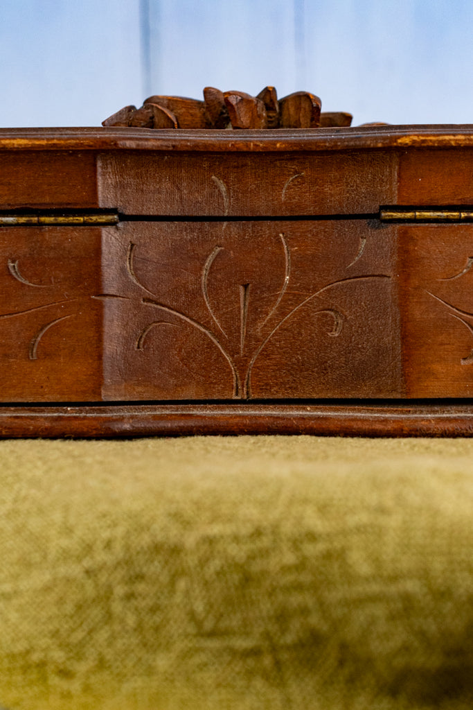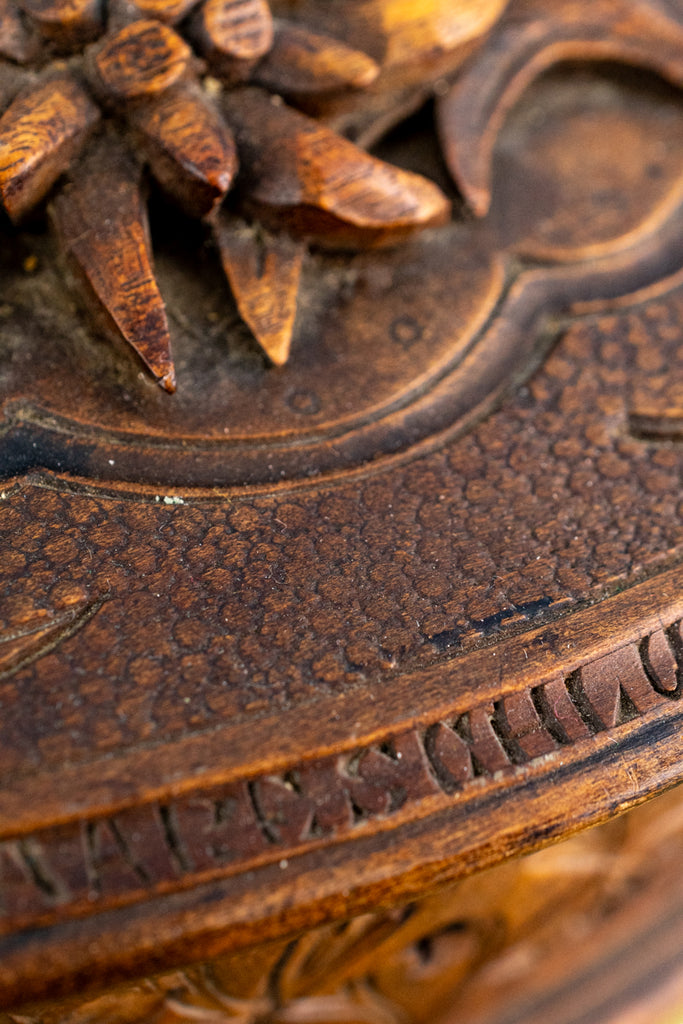 Found at market in Paris, we are pleased to offer this fabulously carved wooden Fôret Noir box from the Swiss river wonder the Aareschlucht (Aare Gorge), a one-mile stretch where the river carves through limestone cliffs rising up to 160 feet, with the narrowest section just over three feet wide. A stunning sight, the gorge is a popular tourist attraction, with many visitors also exploring the nearby Reichenbach Falls, immortalized in fiction as the setting of Sherlock Holmes’ (briefly) fatal encounter with Professor Moriarty.