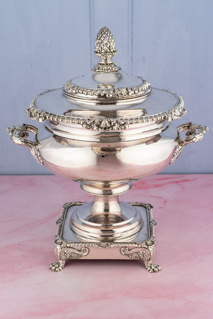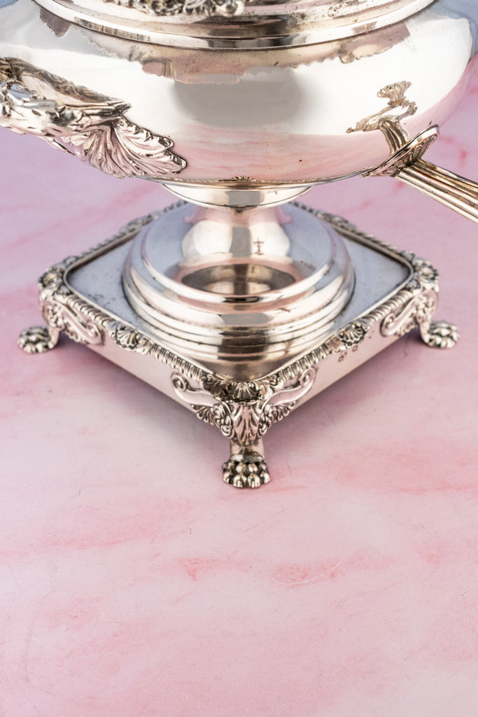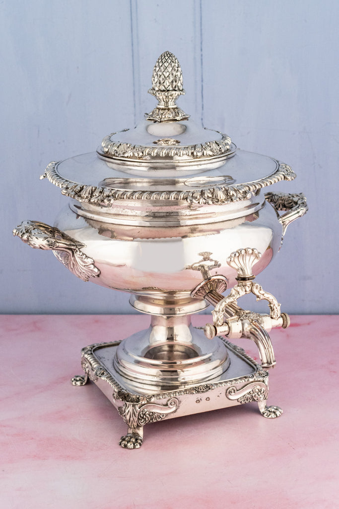 A wonderful surprise find at market in the north of England, this stunning Antique Silverplate Grand Urn elegantly shimmers from every angle. Beautifully crafted by silversmith Matthew Boulton (both the body and the lid feature his distinctive hallmark), its graceful silhouette epitomizes a bygone era of gracious hospitality. A crowning finial enhances this urn's majestic presence, while a stylish center spigot and release handle stand ready to serve.
