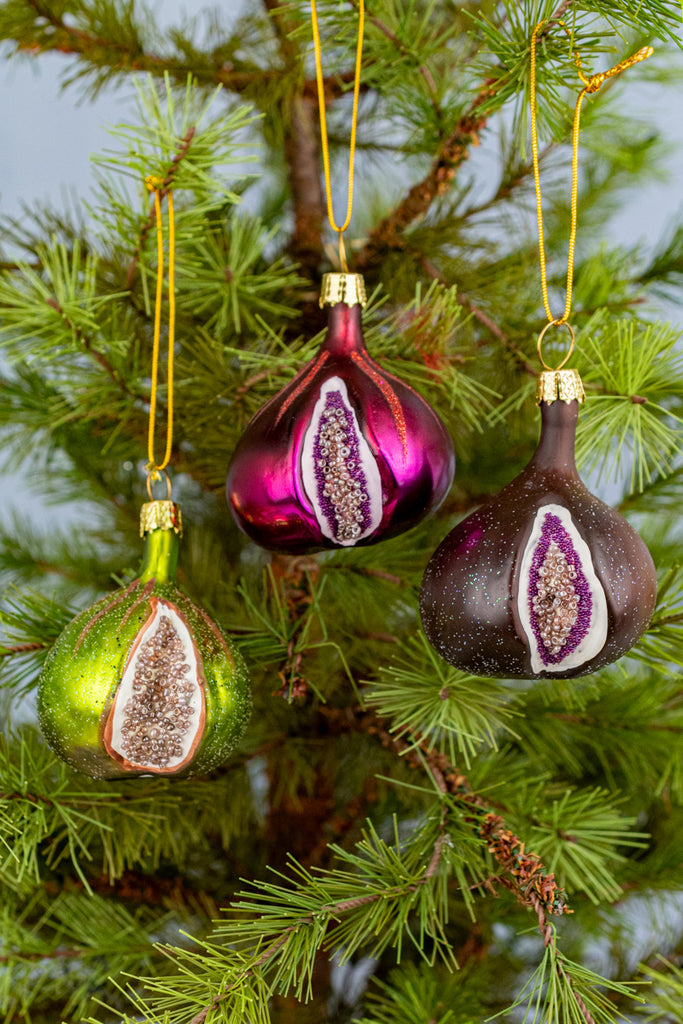 With rich tones that capture the luminescence and soft texture of the romantic fig, this set of 3 Glass Ornaments depicts freshly cut fruits that reveal the nectar to be found within. In hues of deep aubergine, brilliant fuchsia and verdant green cleverly accented by shimmering seed beads, these hand-finished ornaments promise to bring their magical spirit to your tree. Lavish in nature with an old-world Christmas mystique, we are confident these elegant figs will sweeten your holiday to the delight one and all.