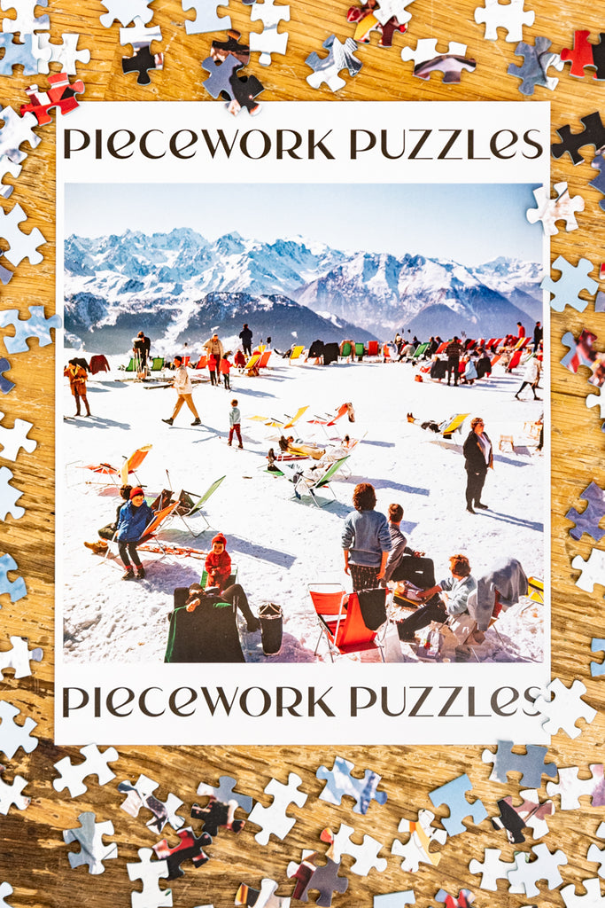 From a lively scene set in 1964, this Verbier Vacation Piecework Puzzle captures a sun-drenched slope in the Swiss Alps. Covered by a sea of colorful sling loungers filled with winter sports revelers on holiday, this 750-piece puzzle was vividly imagined from an iconic photograph by Slim Aarons.