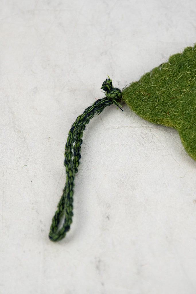 Created from individual evergreen-toned die cut panels that resemble inverse Christmas trees strung together, the banner's three layers of wool have been affixed to one another in a romantic, rustic style. With its handsome texture and bold proclamation, this striking greeting extends holiday cheer to one and all!