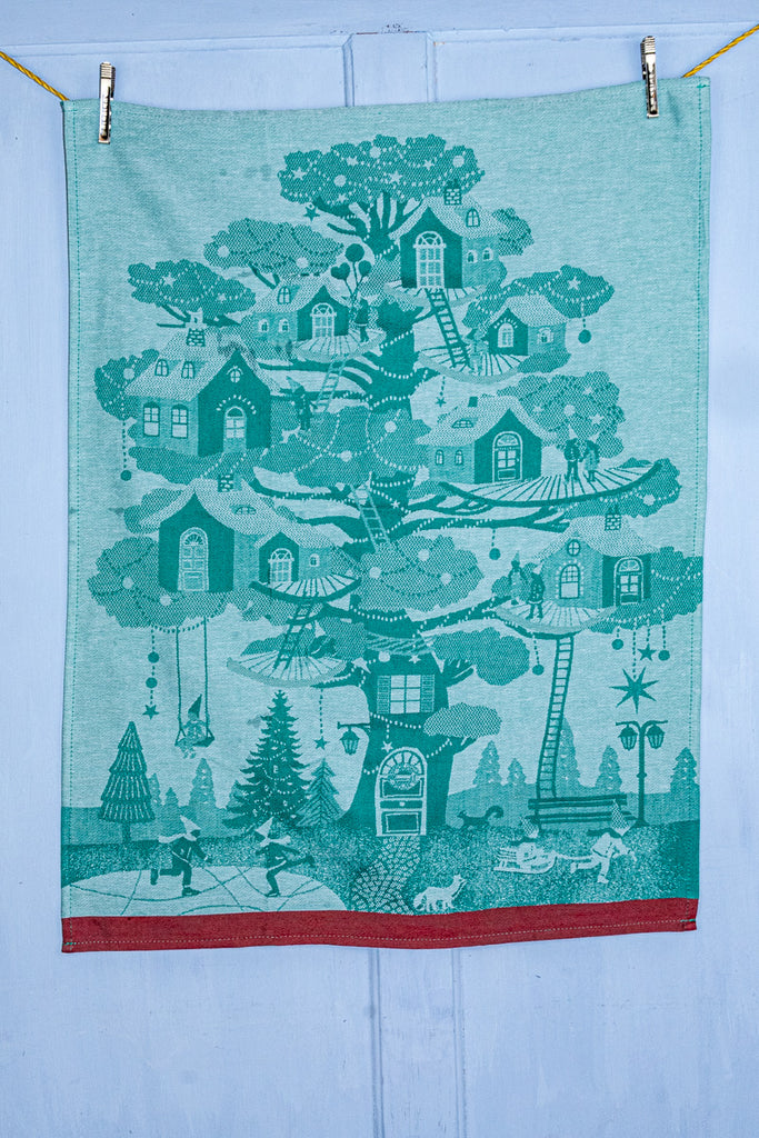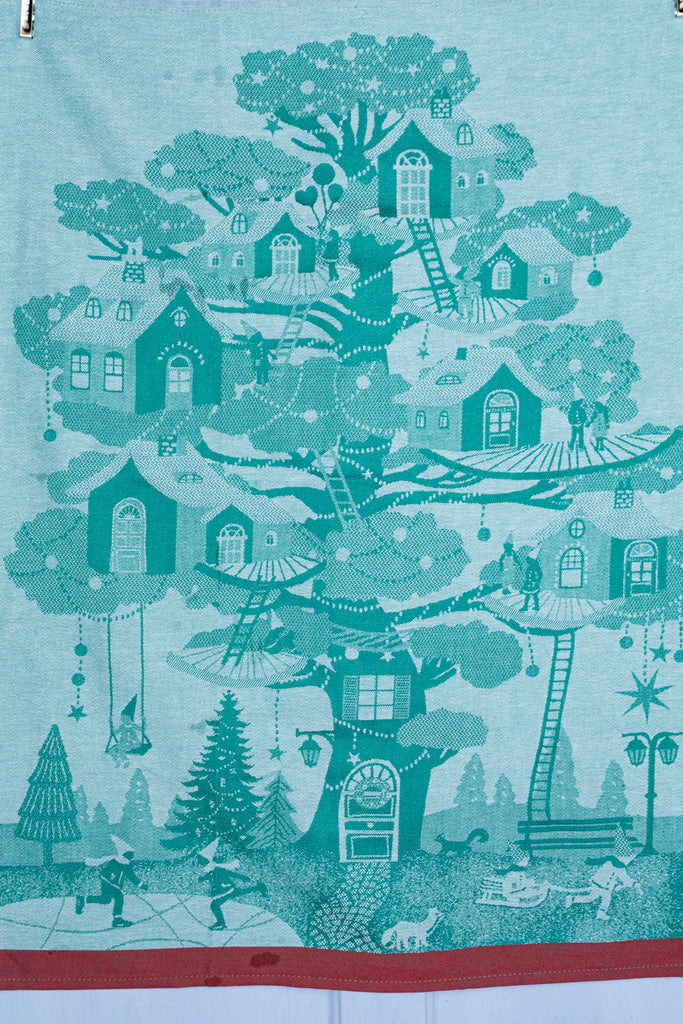 From our favorite French weavers, a festive jacquard towel that captures the spirit of the season. Beautifully woven in a cheerful green with a band of smart red, this magical towel is covered by a mystical tree of bijoux cottages connected by petite ladders. Throughout the snow-covered scene, charming enfants (children) celebrate the spirit of the season.