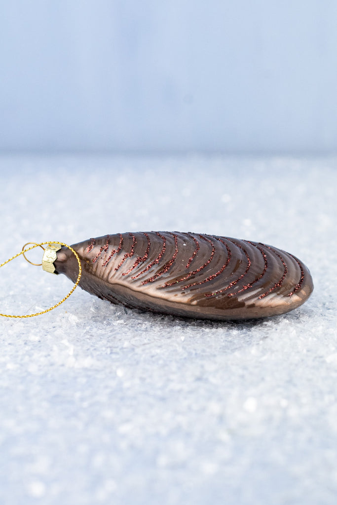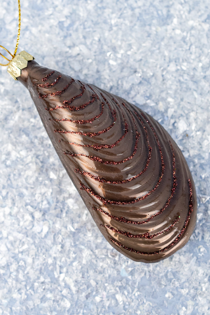 Whether discovered as a shimmering shell abandoned upon the beach or piled within a copper pot of delectable moules marinières swimming in a sea of broth with garlic and parsley, the humble mussel is always a surprising delight. This festive Mussel Glass Ornament is no exception! Its rich copper-hued shell has been kissed with a touch of glitter to accent the patterned annuli that mark a mussel's age, and with some species living to a century or more, that could be a lot of glitter! Sure to sparkle among the branches, it promises to bring its elegant simplicity to your tree.