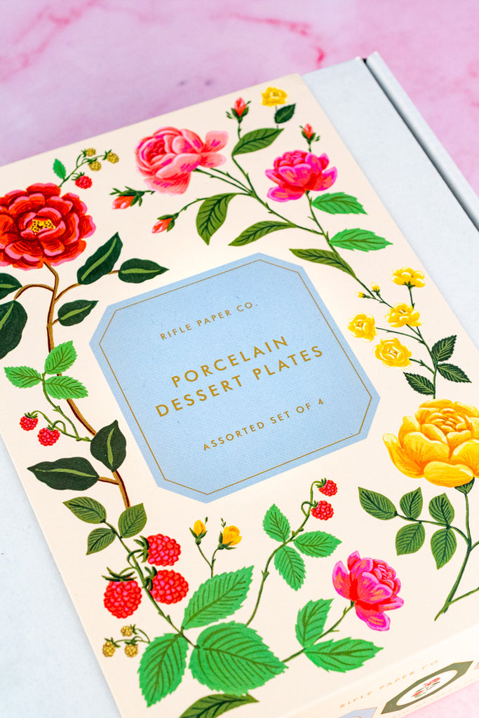 Perfect for a tea party, these elegant painted roses adorn these porcelain dessert plates, feature four distinct designs, shimmering gold accents, and gold-painted edges.