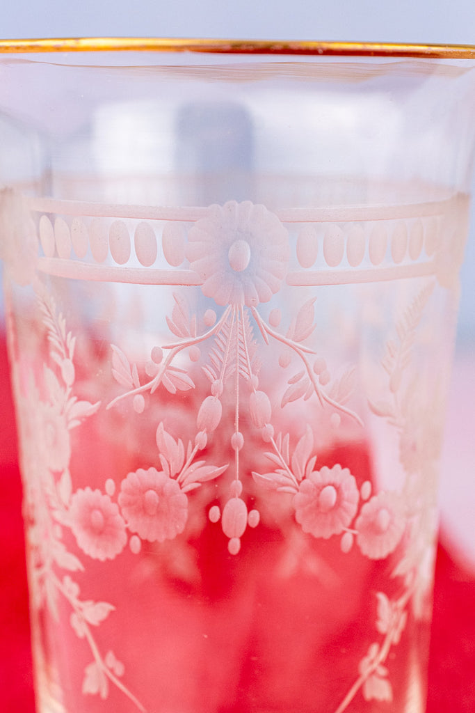 Beautifully engraved with swags and tendrils of delicate flowers, leaves, and berries, each piece was made individually by hand. Each could require more than twenty artisans to see a piece through its journey to completion: from preparing a wooden mold, mixing and melting the batch of glass ingredients, blowing the molten glass, grinding, rinsing, copper wheel engraving decoration, polishing, painting, and burning off gold detailing before firing.