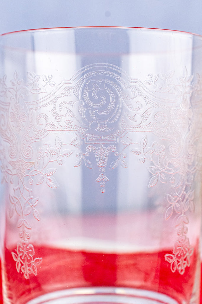Strictly one-of-a-kind and subject to prior sale. In very good vintage condition, circa 1930s and 1940s. Handwashing recommended. Double Old Fashioned: 3.5"D x 4.5"H. Tumbler: 3.5"D x 5"H. Water: 3"D x 4.25"H. Sold individually and in limited quantities.