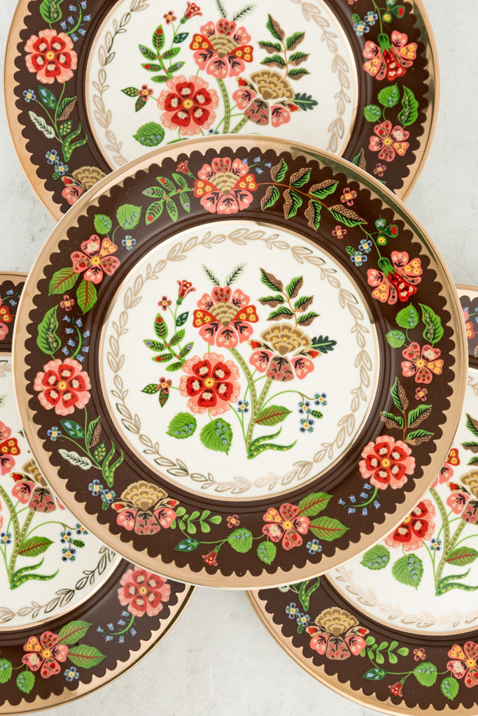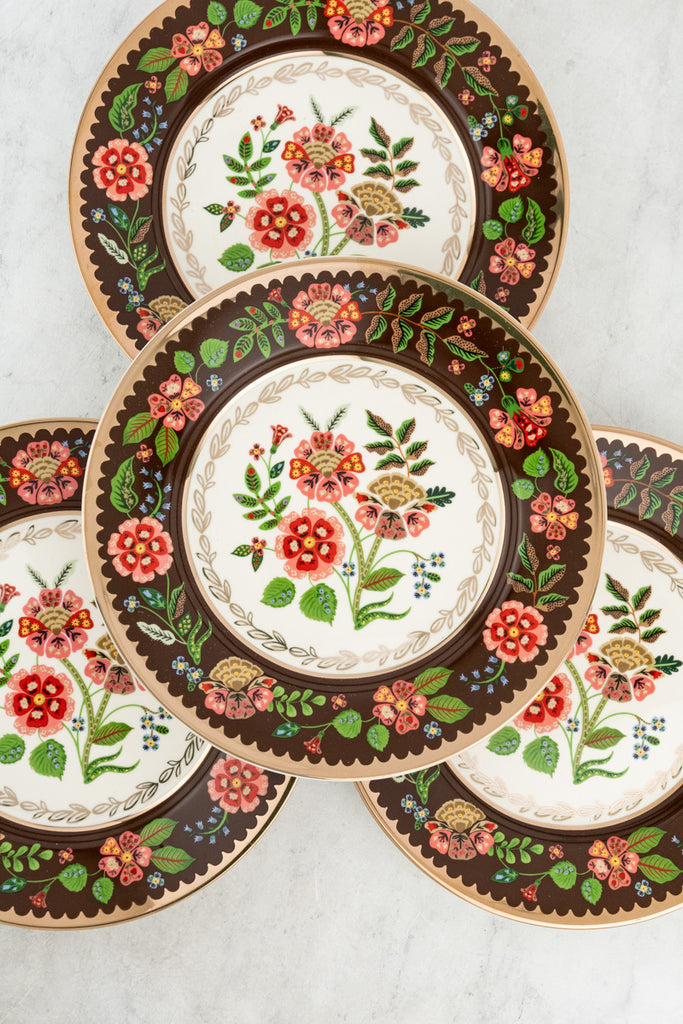 Elevate your table with these smart-patterned dinner plates with their intricate, Jacobean-inspired florals. Shimmering with gold accents as well as a gleaming gilt rim, these lovely plates are ideally-sized for a first course, salad or dessert.