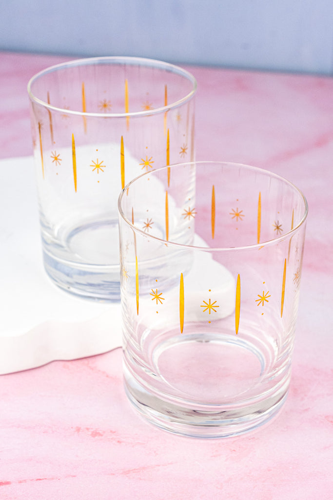 With just a touch of golden glamour, our Starlit Double Old Fashioned Glasses capture the ineffable magic of the stars with every sip. Wrapped in shimmering gold detail, each glass features stars and lines around the sides, bringing to mind shooting stars streaking across the sky. With glimmering charm, these glasses bring shining starlight to every occasion.