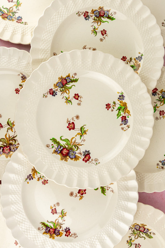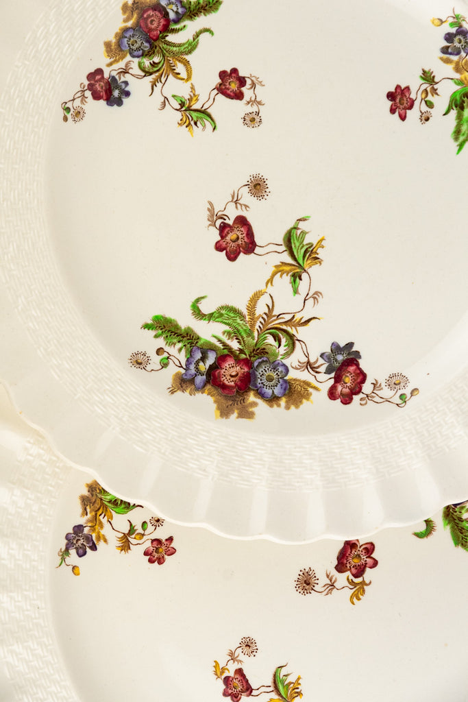 This stunning set of Copeland Spode Dinner Plates has arrived from market just in time for holiday feasting. Featuring delicate hand-painted florals in varying combinations, each distinctive plate has been created with blooms of similar size and scale that blend seamlessly upon the table. Executed in a scalloped plate style accented by an articulated basketweave rim, this classic Spode silhouette is known as the "Chelsea Wicker" shape.