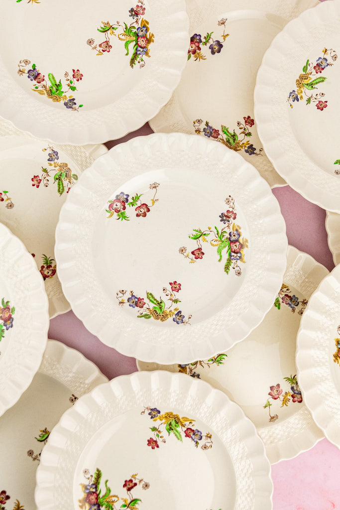 First introduced in the 1921, this optimistic pattern of lively blooms upon a creamy background is called Wicker Lane. With the dimensional movement of flowers playfully escaping from a hand-gathered posy and a regal color palette befitting the fine legacy and craftsmanship for which Spode has been prized for more than 250 years, these plates are sure to brighten any table. At home for the most formal of occasions, yet brimming with cozy charm, this sweet set is also lovely on display. With a timeless nature and versatile size, we are confident they will become an indispensable addition to your tableware collection.