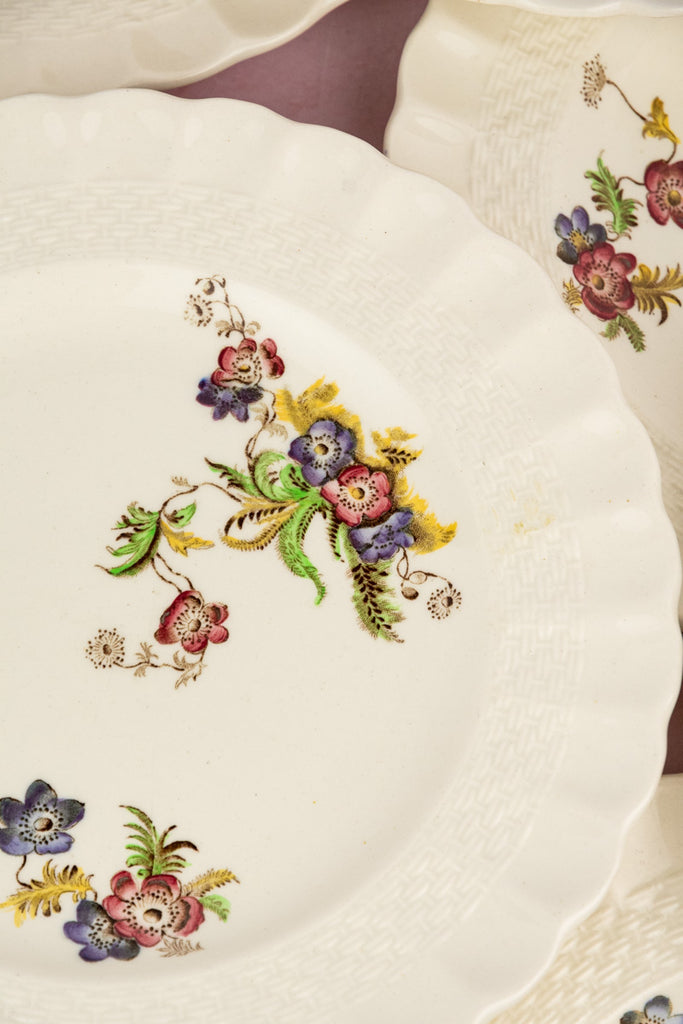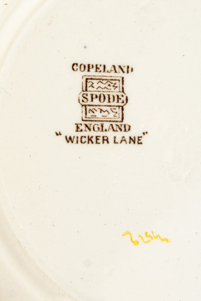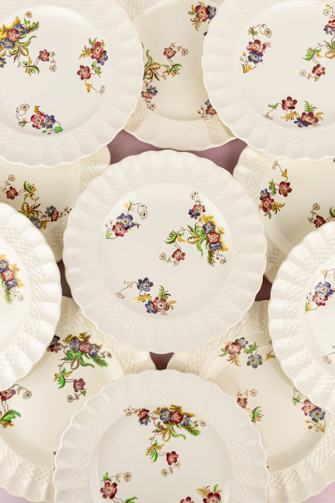 This lovely set of Copeland Spode Dessert Plates is sure to make your final course even sweeter. Covered in delicate hand-painted florals, each plate has been created with unique blooms of similar size and scale in order to blend seamlessly as a set. Produced in a scalloped plate style accented by an articulated basketweave rim, this classic Spode silhouette is known as the "Chelsea Wicker" shape.
