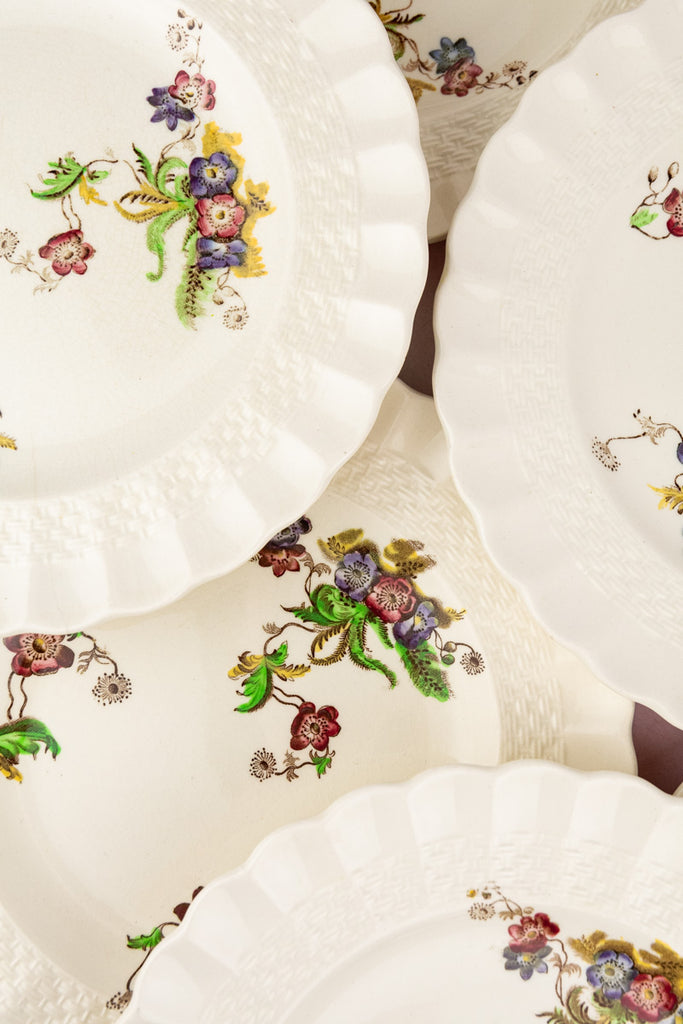 First introduced in the 1921, this optimistic pattern of lively blooms is called Wicker Lane. With the dimensional movement of flowers playfully escaping from a hand-gathered posy and a regal color palette befitting the fine legacy and craftsmanship for which Spode has been prized for more than two and a half centuries, these plates are sure to brighten every occasion. From formal dinner to afternoon tea, this striking set is also ideal for a salad or cheese course. Promising to bring an evocative touch of romance to each table setting, this magnificent set is sure to become a cherished addition to your collection.