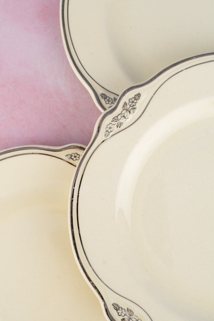 Produced beginning in 1932 in a variation with subtle embellishment and handsome trim, this charming set is ideal for everything from Friday night's impromptu l'apero to weeknight dessert as a lovely backdrop for a sliver of cake or a slice of pie. The soft creamy background is also ideal for layering into a stylish tablescape for presentation of a first course, biscuits on a tea tray or easing into the morning with crisp toast or a buttery croissant. The striking design around the angular rim adds a comforting, homey quality that is sure to add a fresh yet timeless feel to your tableware collection.