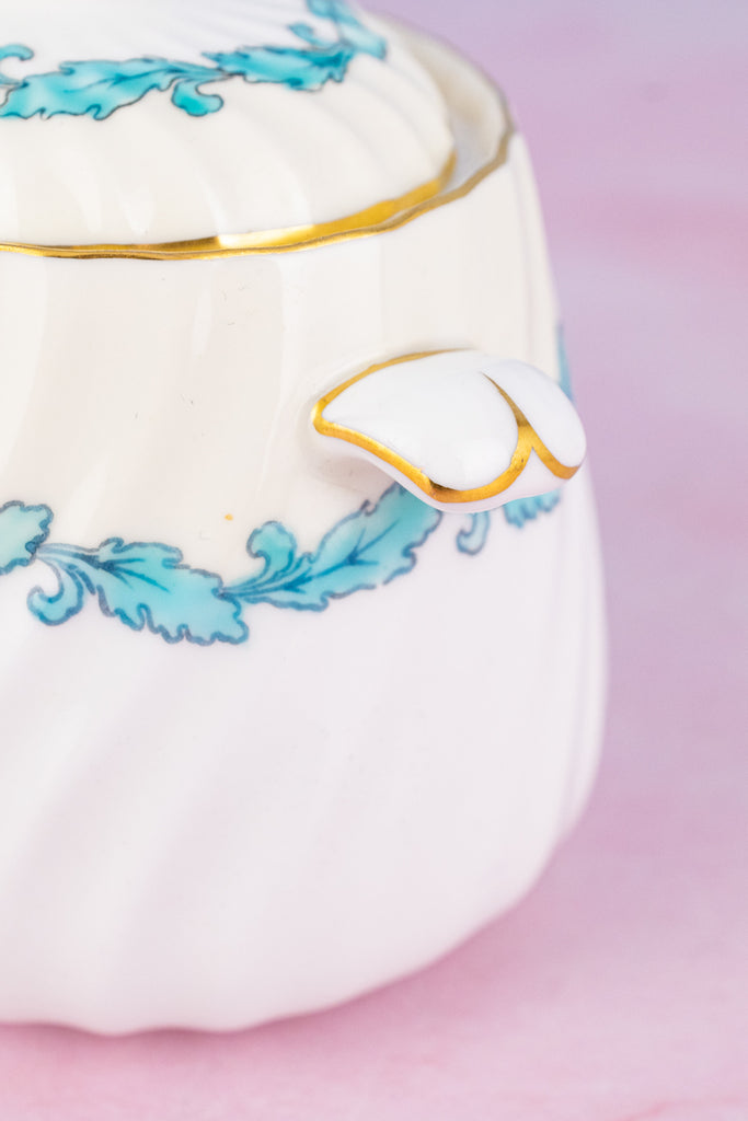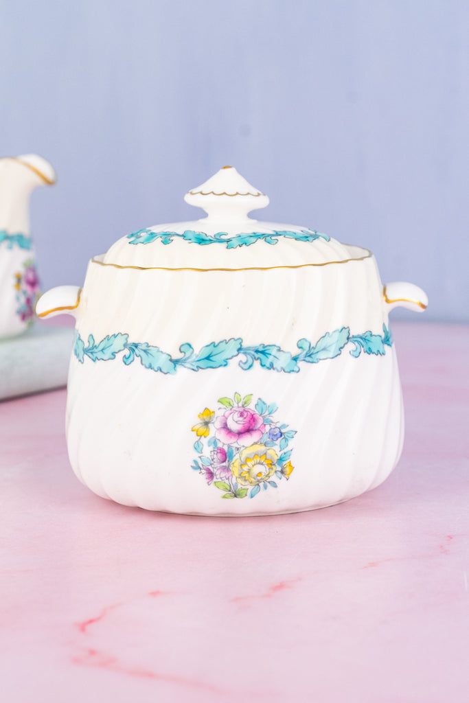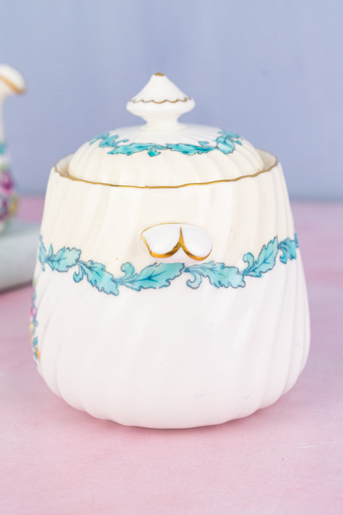 With their cheerful yet sophisticated design, this Vintage Minton Cream and Sugar set is certain to find its place in a stunning tea service. Crafted and expertly painted by the firm’s fine potters and decorators at Stoke-on-Trent, this duo features Minton’s mid-century "Ardmore" pattern in turquoise and ivory. Beautifully embellished with a timeless turquoise leaf motif that dances gracefully across the surface of the china and featuring gold scalloping and delightful floral bouquets, this gorgeous pair is a feast for the eyes!