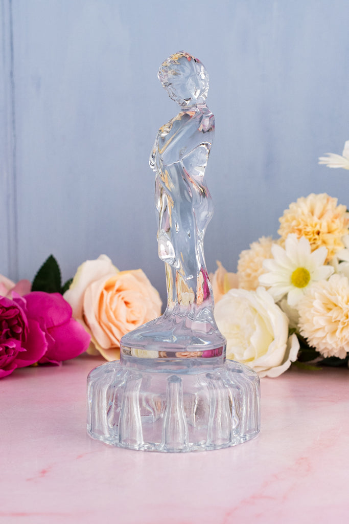 The exquisite figure known as the "Draped Lady" (often called "Bashful Charlotte") makes a luxurious impression in bright clear glass, standing on a pedestal surrounded by small holes into which cut flower stems may be inserted to create a striking display. Although representing a woman, a floral holder of this style is most often called a “flower frog”—or more prosaically, a “flower arranger.” At a time when it was more de rigueur to cultivate flower varieties in the garden and bring them indoors for decoration and enjoyment, these flower frogs were part of everyday household equipment.