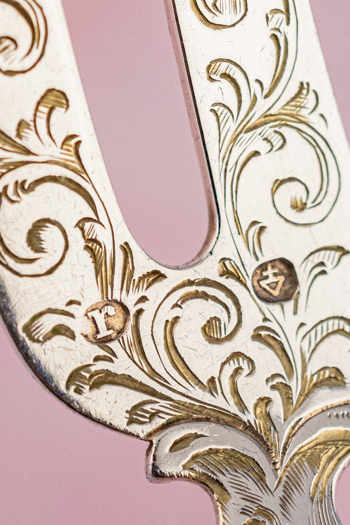 Specific cutlery for serving and eating fish evolved in early 19th-century England. In 1838, a book of etiquette observed that “in first rate society, silver knives are now beginning to be used for fish: a very pleasing, as well as decided step in the progress of refinement.” People of means gradually set aside steel knives and forks, as carbon steel was said to react with the acids in fish and certain sauces, potentially affecting flavor. Fish knives and forks were sometimes referred to as “Fish Eaters,” while the larger serving implements were known as “Fish Servers.”