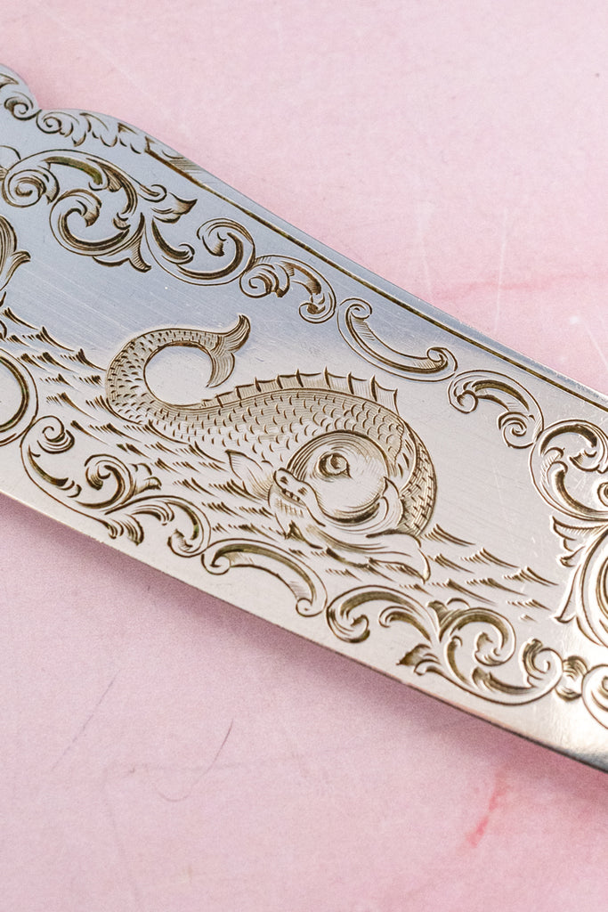 From the silver markets of England, we are thrilled to present this pair of Antique Silverplate Fish Servers. With elegant, dramatic detailing—including a beautifully engraved fish adorning the blade—this handsome pair is certain to impress at any table. Perfect for portioning and serving fish tableside (think magnificent whole poached salmon or roasted sea bass), we also find the serving fork wonderfully useful on its own for everything from chicken breasts to meatloaf or sliced brisket.