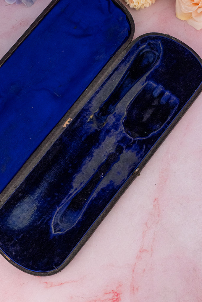 Strictly one-of-a-kind and subject to prior sale. Servers in very good antique condition; case in fair condition. Fish Knife Measures 13" in length. Fish Serving Fork measures 10.25" in length. Presentation box measures 15" x 5" x 1.5".