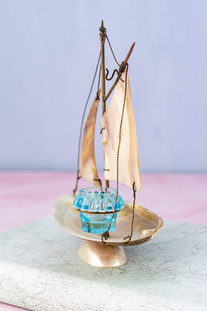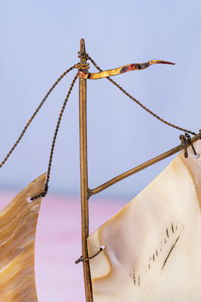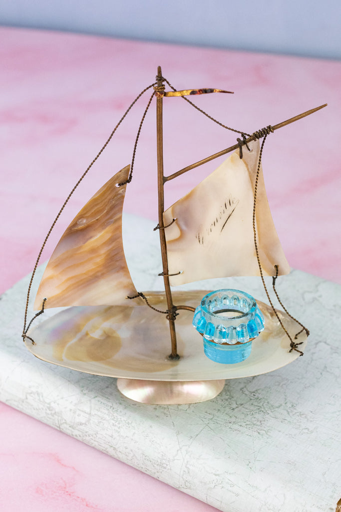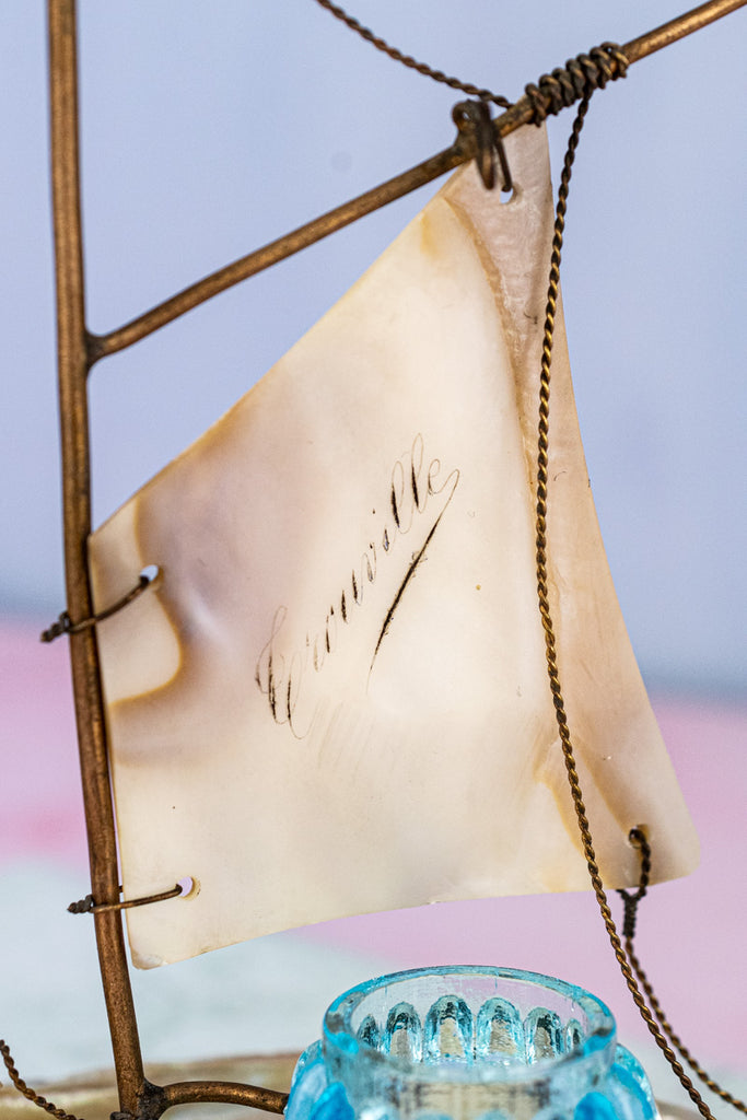 Balanced upon a delicate and shimmering irridescent base, this Antique French Souvenir Mother-of-Pearl Salier was one of the team's favorite finds during our recent visit to the autumn markets of Paris. Artfully crafted from carved mother-of-pearl with delicate brass appointments, the stunning effect is that of a ship at full sail. Set upon the boat's seashell-fashioned deck - a diminutive glass salt cellar the color of soft ocean waves reflected in the sunlight.