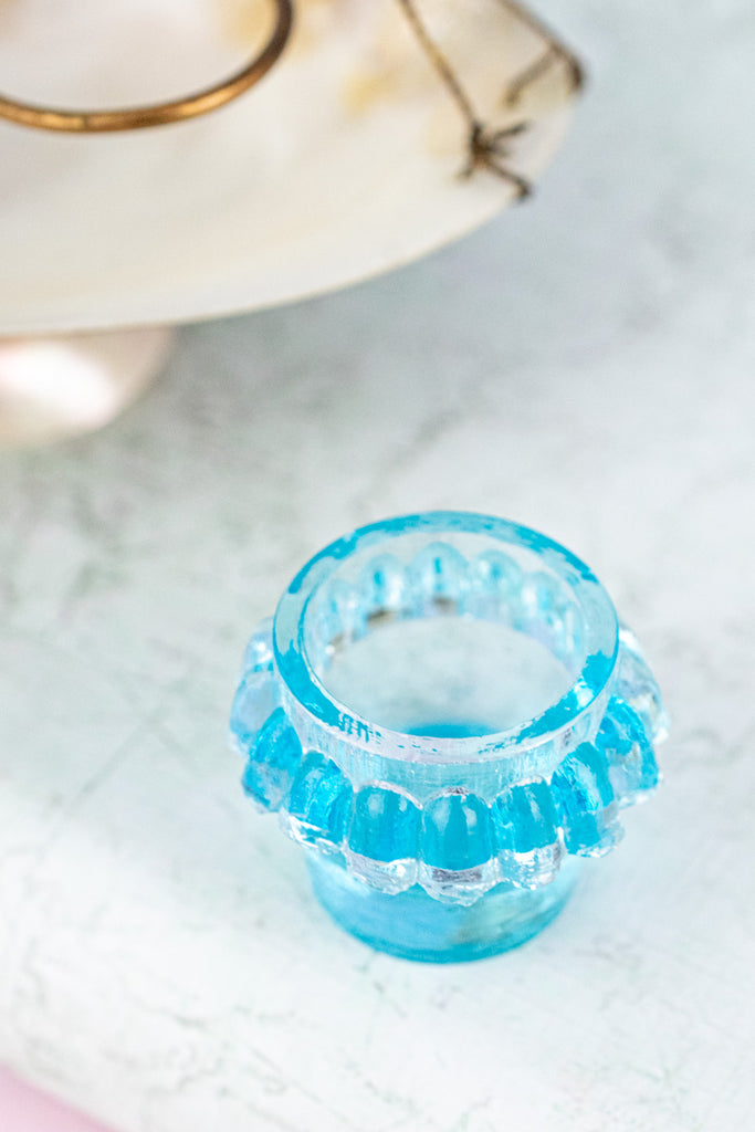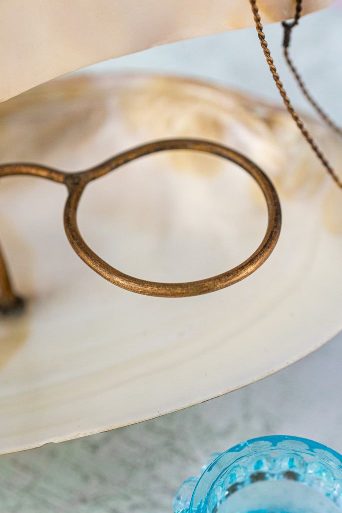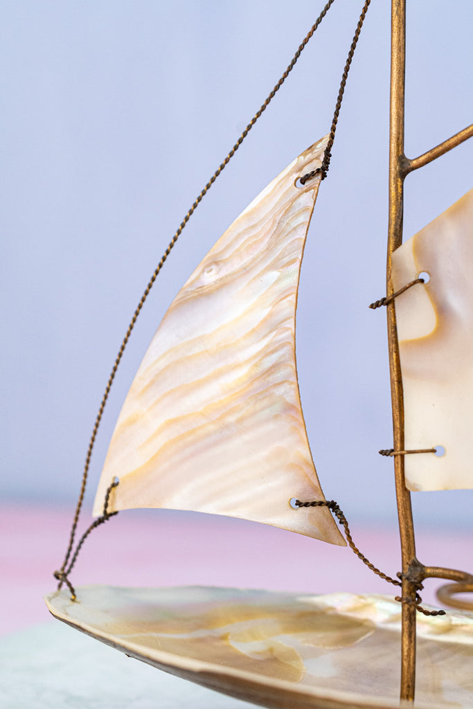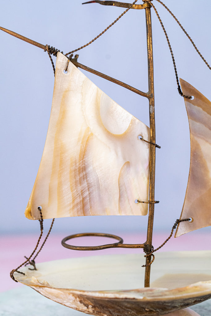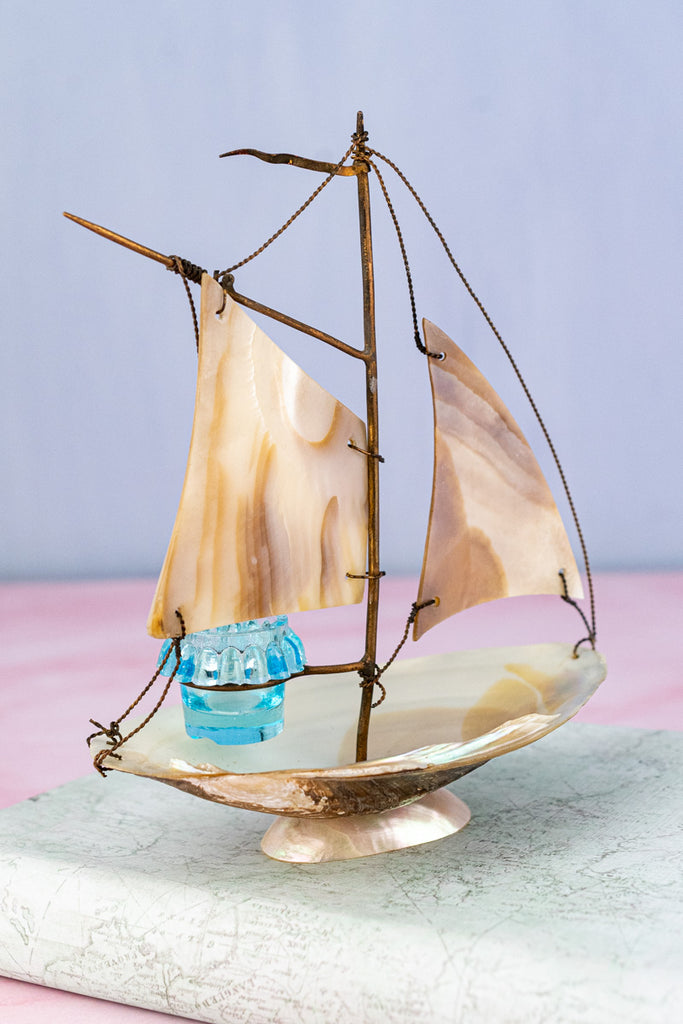 Balanced upon a delicate and shimmering irridescent base, this Antique French Souvenir Mother-of-Pearl Salier was one of the team's favorite finds during our recent visit to the autumn markets of Paris. Artfully crafted from carved mother-of-pearl with delicate brass appointments, the stunning effect is that of a ship at full sail. Set upon the boat's seashell-fashioned deck - a diminutive glass salt cellar the color of soft ocean waves reflected in the sunlight.