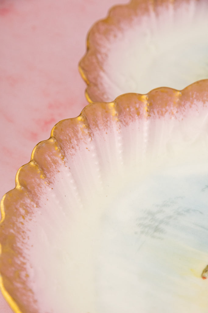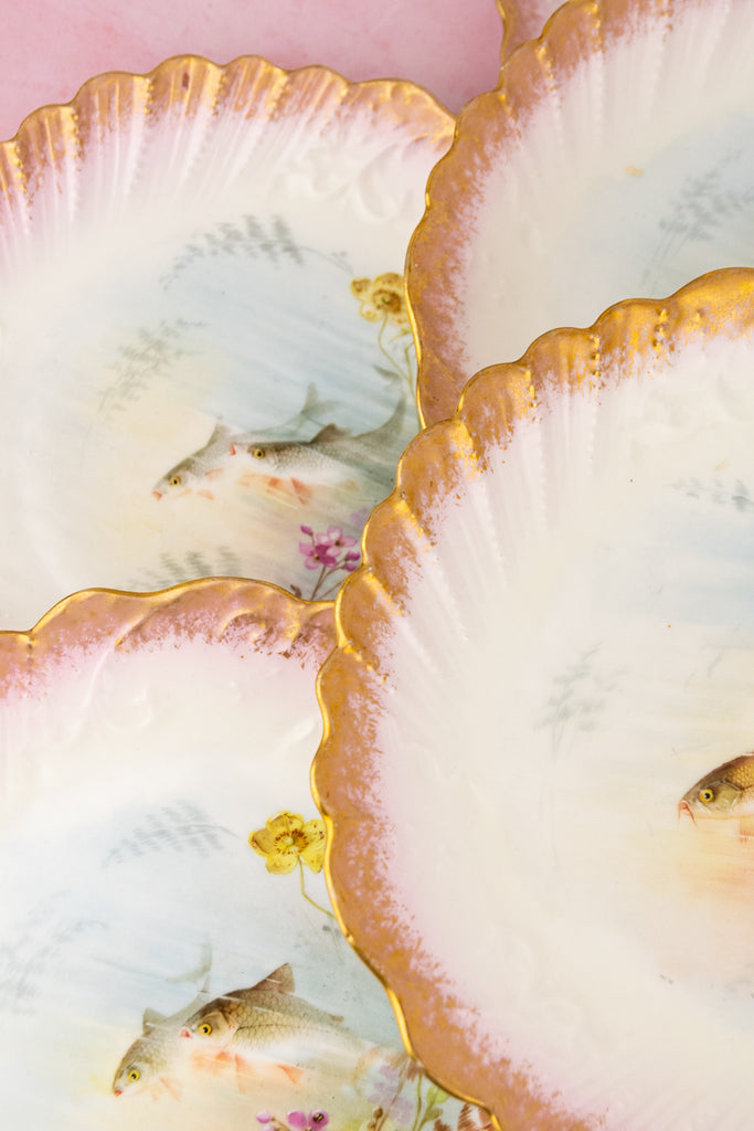 The scalloped rims are washed in the palest blush pink and richly accented with gilded highlights, lending a warm glow and subtle opulence to the ensemble. The gold trim frames each aquatic vignette beautifully, adding just the right touch of sparkle for a celebratory fish course.
