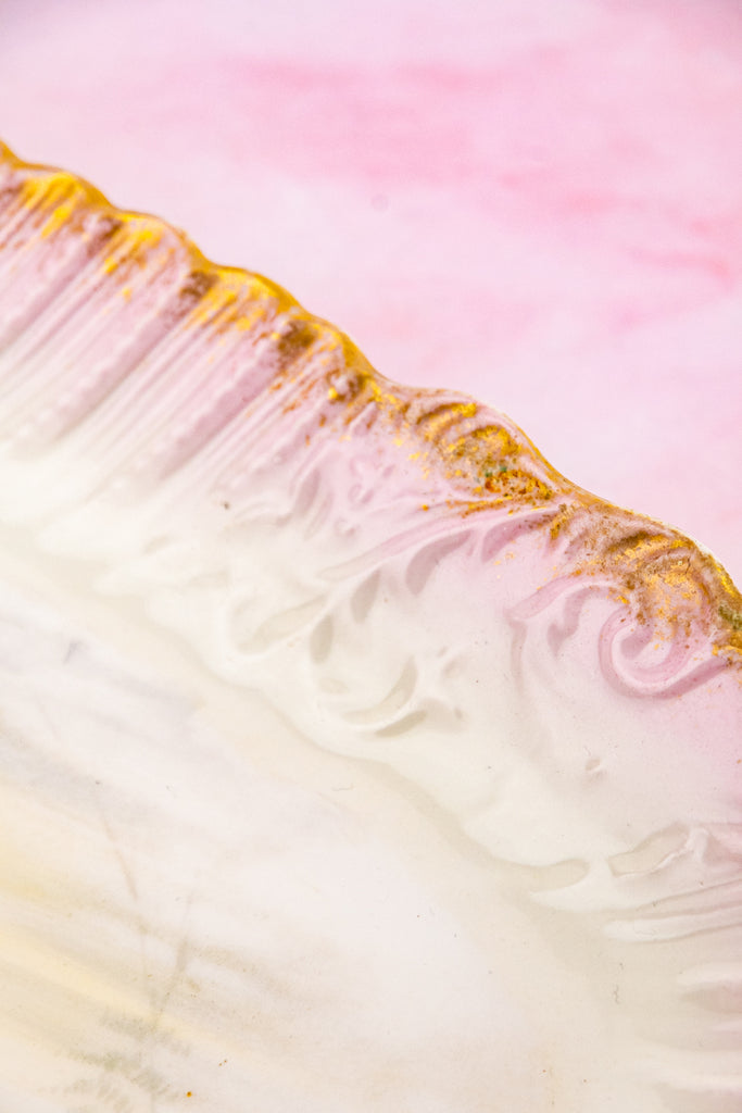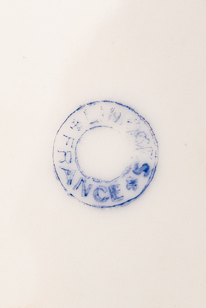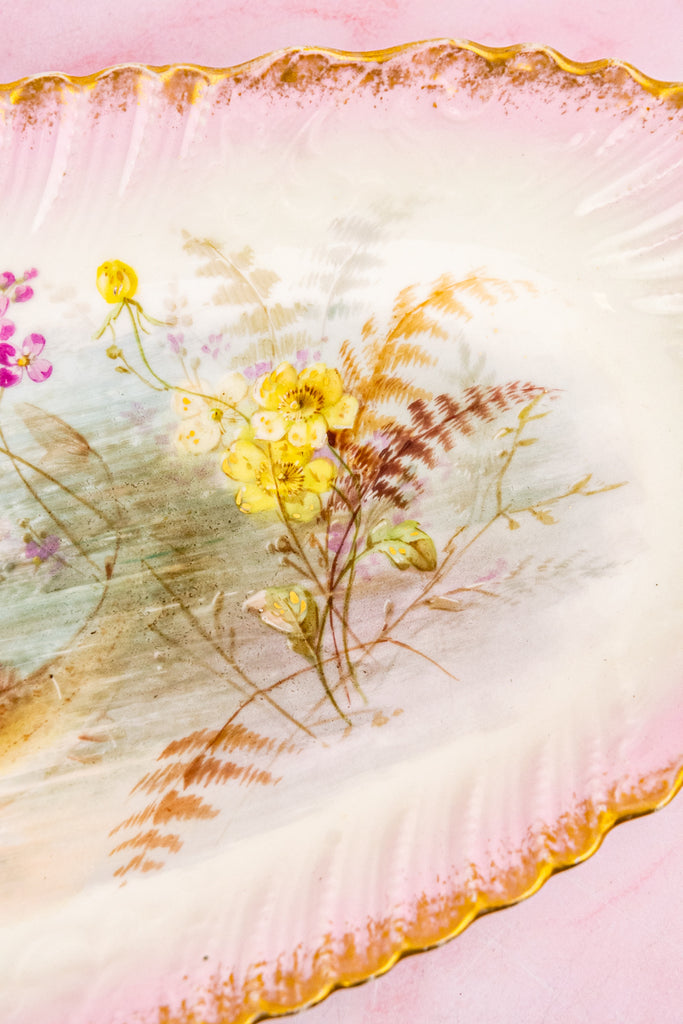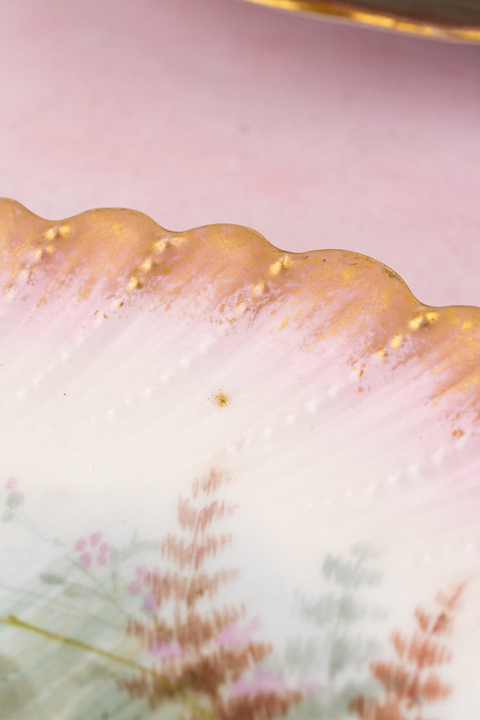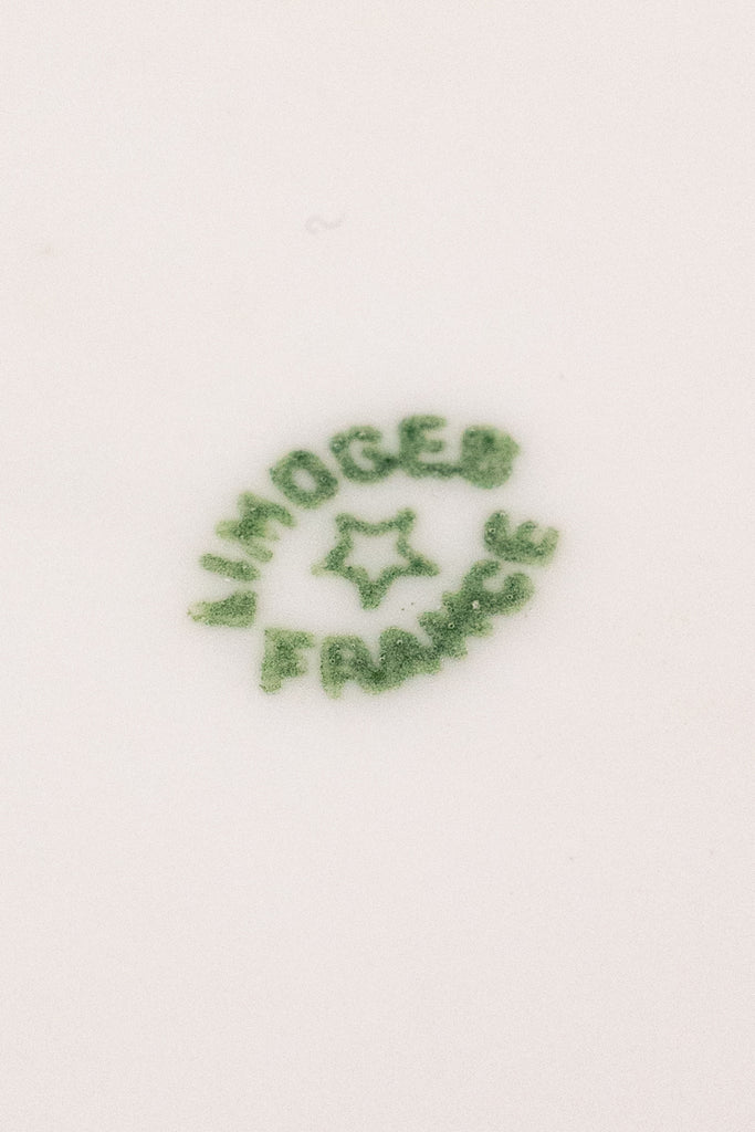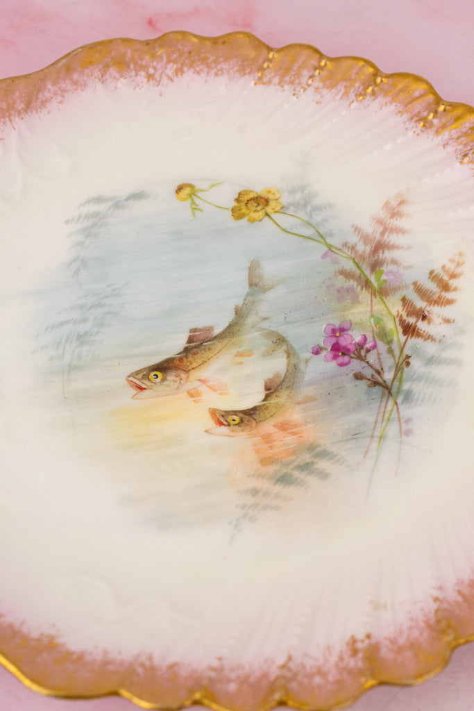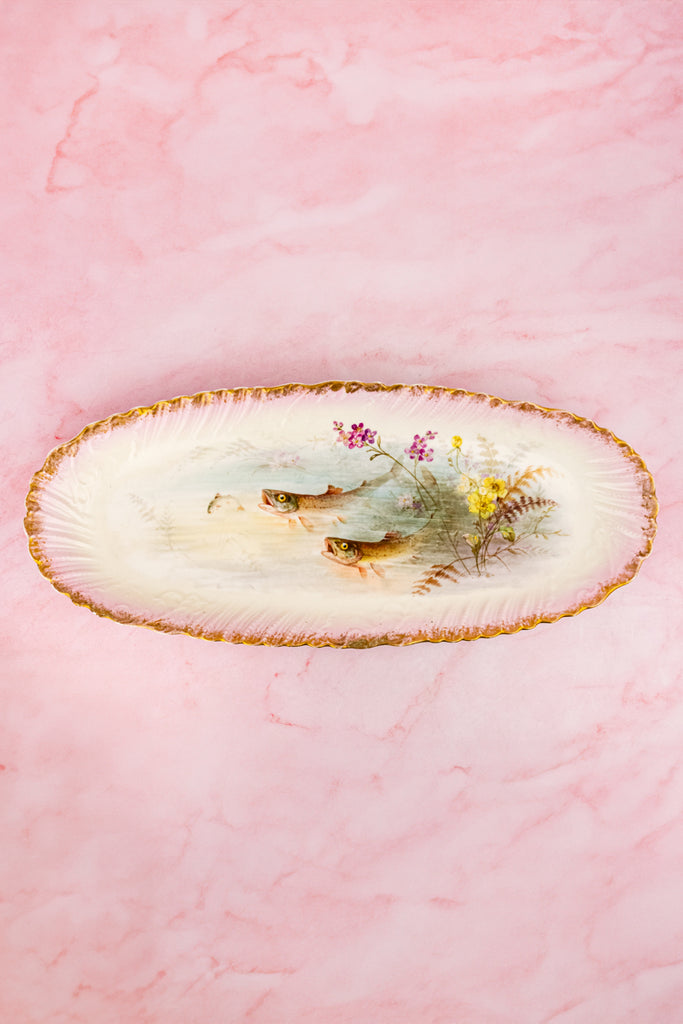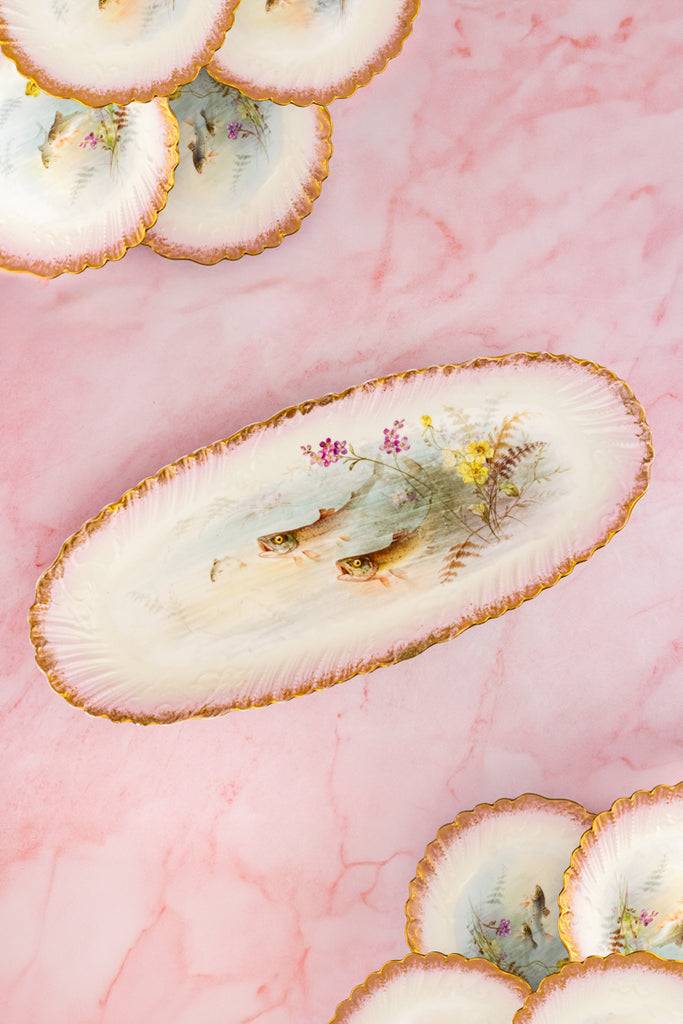 Case in point: this exquisite antique Limoges Fish Service, comprised of eight plates and a generous serving platter. This graceful service comes to us from Latrille Frères, a French porcelain manufacturer active from 1899 to 1913. Each piece is delicately hand-decorated in soft, watery hues with finely detailed fish gliding through gentle currents, accompanied by flowering water plants and fern-like fronds. The painterly scenes feel almost suspended beneath the glaze—serene, luminous, and quietly alive.