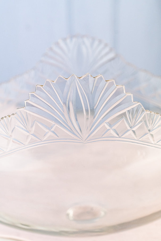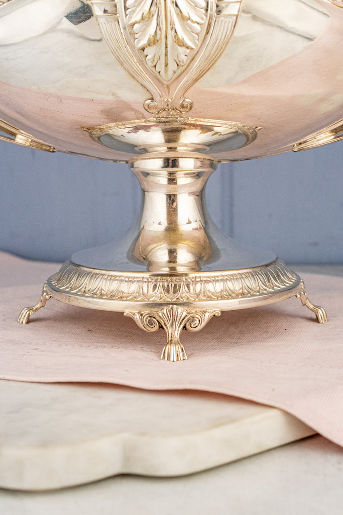 Found at a silver market in northern England, we were thrilled to discover this Antique Centerpiece Bowl with its exquisite clear glass edged liner - stunning in every way! Richly ornate with pristine cuts that form the image of an open fan at center, the top edge appears to move in the light as a cascade of saw-tooth edges flow outwards towards the dramatic loving cup style handles. Poised at just the right angle to transport with ease, the articulated handles are expertly embellished with a lovely design. This magnificent upper vessel fits seamlessly within a gleaming silver-plate pedestal base that rises from four captivating, diminutive feet.