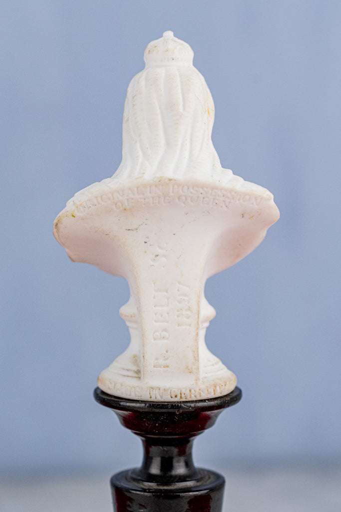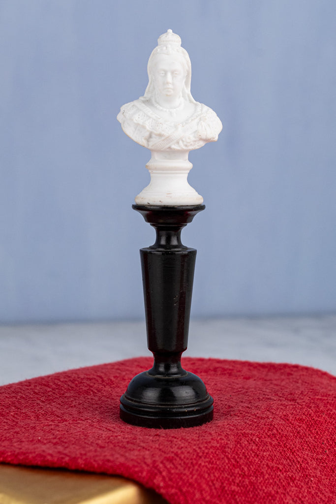 Produced to commemorate the 1897 Jubilee Year of Queen Victoria's reign, this miniature Queen Victoria Commemorative Bust was discovered this autumn at market in the north of England. Presented on a turned ebony wood socle, the bust is a commercially-scaled miniaturization of an original work by English sculptor, Richard Claude Belt. Known for portraits, architectural carving, and monumental sculptures like Casualties of War (1918), he often signed his work 'R. Belt Sc.'