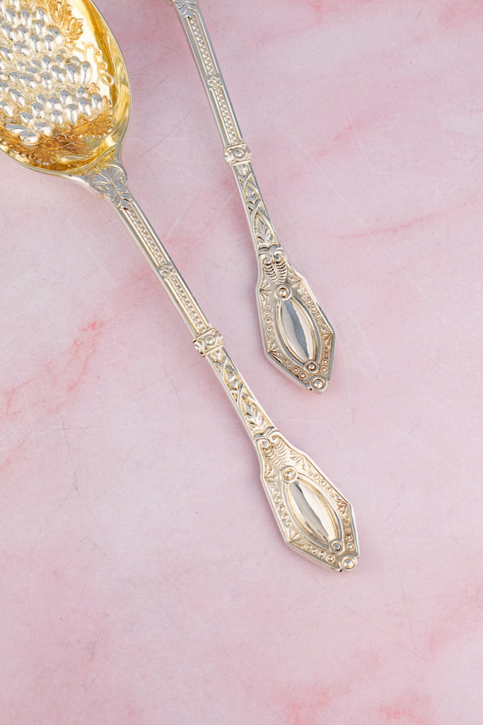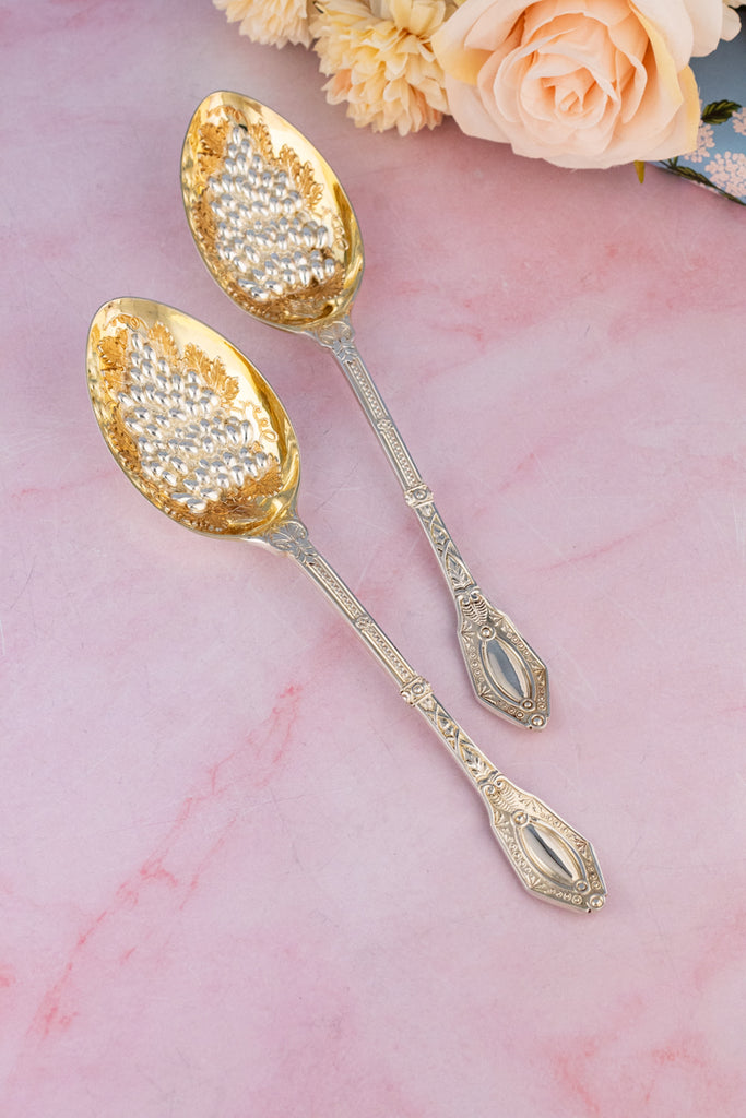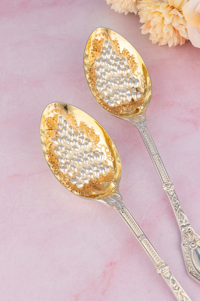 Found at an antiques market in northern England, we are so pleased to offer this magnificent Victorian Silverplate Berry Serving Spoon Pair. In their original fitted presentation case, lined in ice blue satin, the set includes a pair of matching berry spoons. These sparkling tabletop treasures were designed for serving fresh fruit. The bowls of the spoons are intricately embossed with an abundant assortment of leafy fronds and fruits and are parcel gilt to protect the silver from fruit acids. The handles are expertly hand-engraved with lovely decorations.