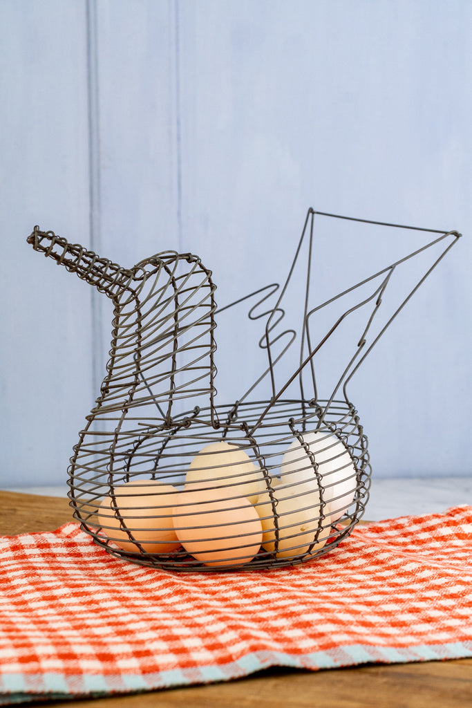 Carefully shaped into the image of a bird, the adorable container was originally used for gathering morning eggs from the backyard hens. With convenient carry handles to transport the precious oeufs (eggs) and an unexpectedly lavish silhouette, the basket was expertly crafted by hand from heavy-gauge wire.