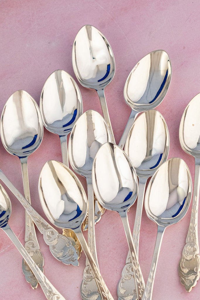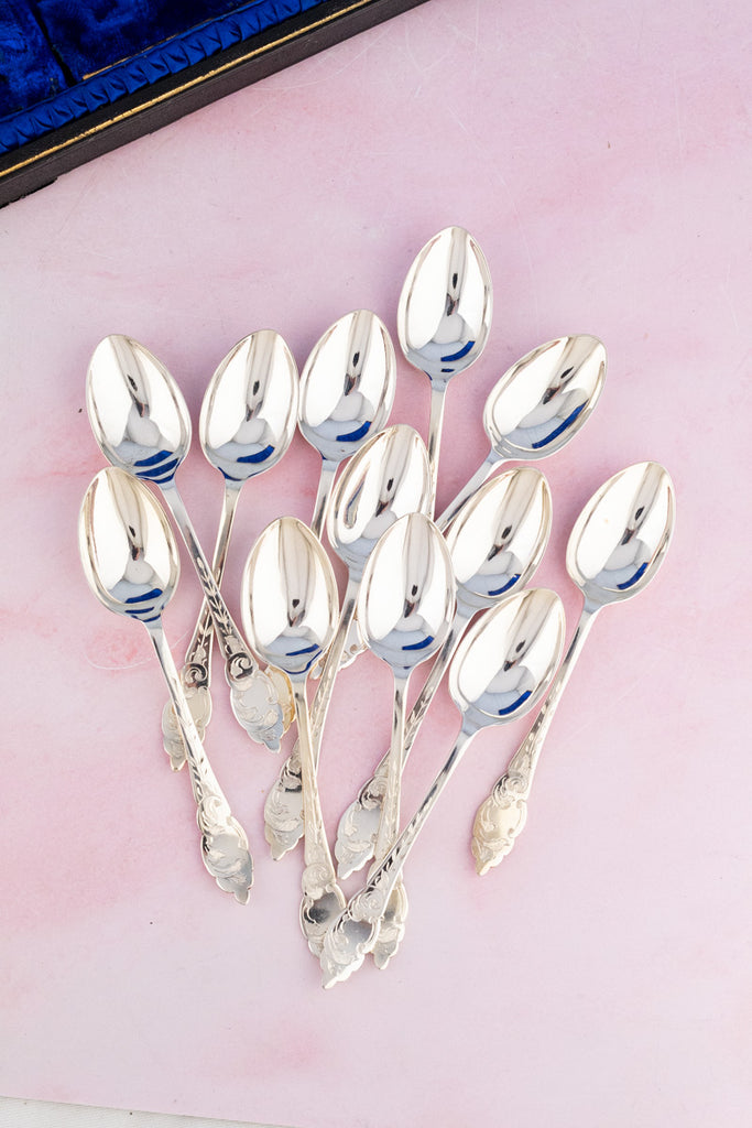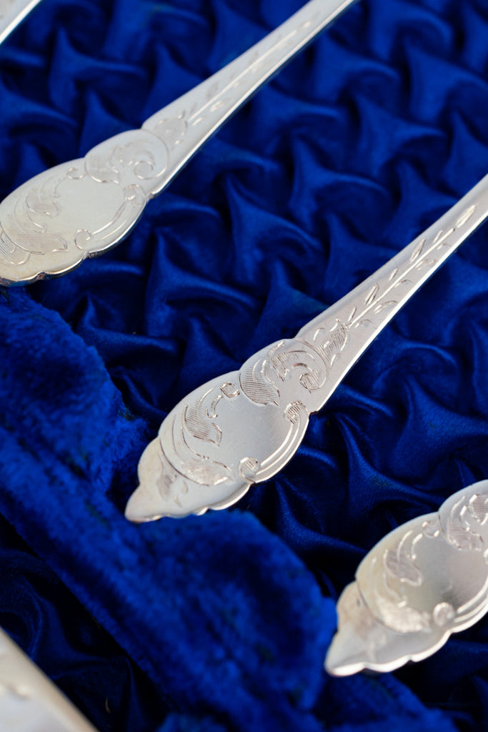 From the heart of the English countryside, this Vintage Silverplate Afternoon Tea Cutlery Service brings together all the serving niceties needed for afternoon tea at home. Created in sweet style with an artful attention to detail, this lovely set in its original presentation box includes 12 teaspoons, sugar tongs, jam spoon, and spreader.