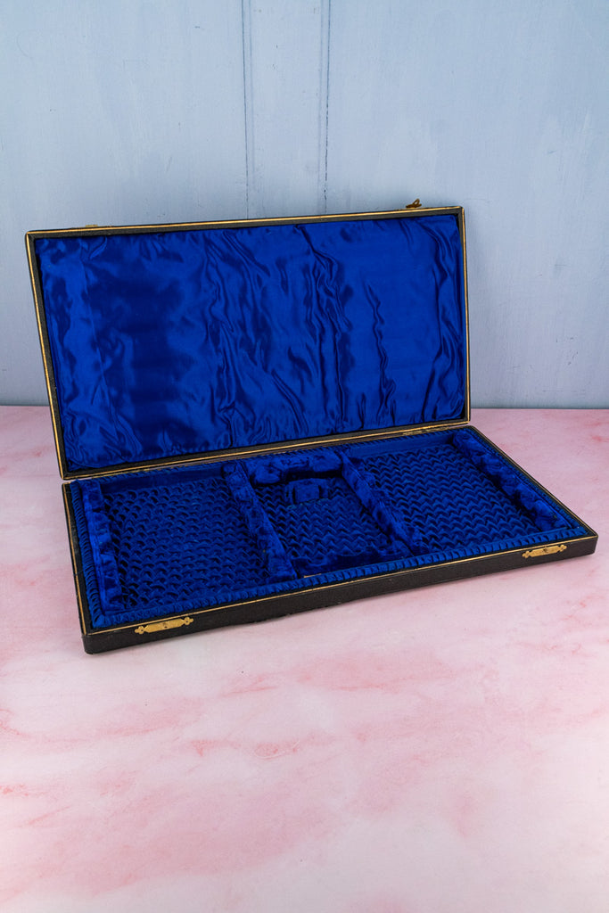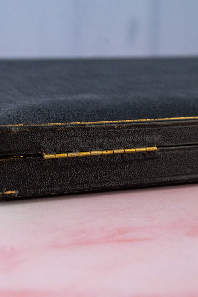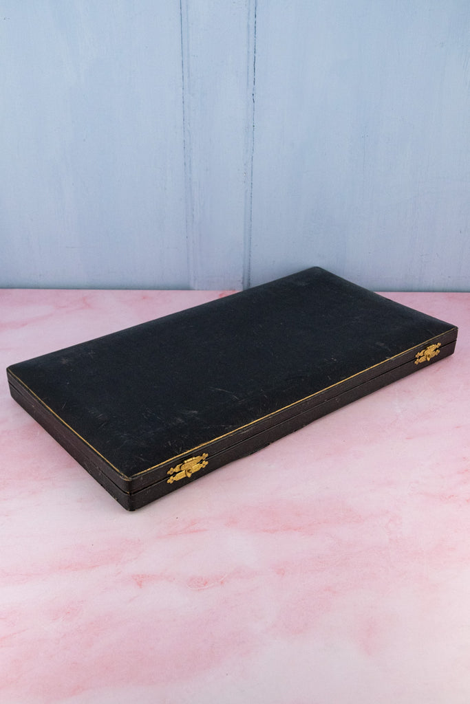 Strictly one-of-a-kind and subject to prior sale. In very good antique condition. Box measures 16.5"W x 9"L x 1.75"H. Spoons 5"L. Jam spoon: 6.5"L. Spreader: 6.75"L. Tongs 4.5"L.