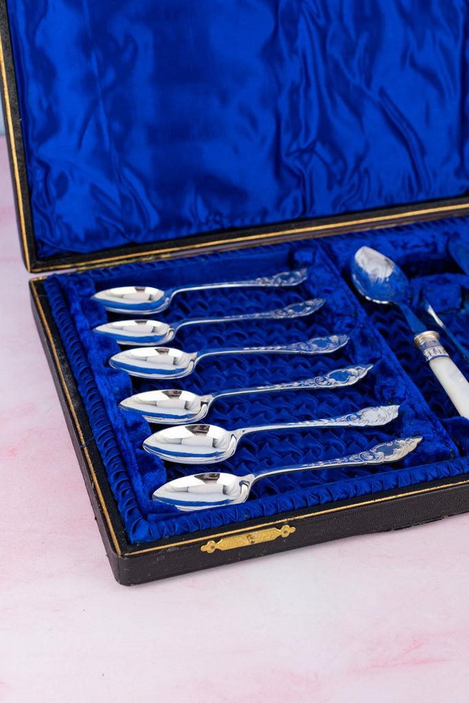 Antique English Silverplate & Mother of Pearl Tea Cutlery for 12
